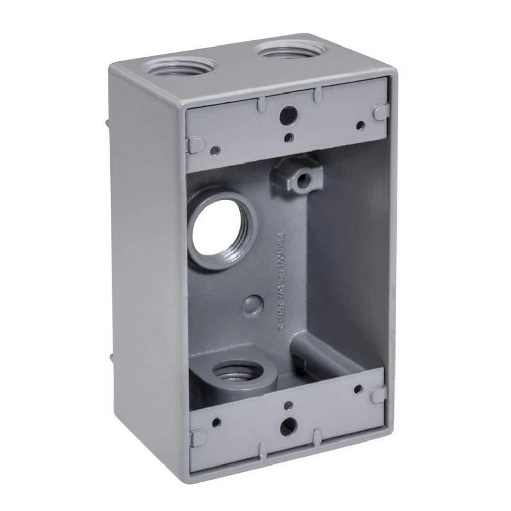 Topaz’s Weatherproof Single Gang 4-Hole Boxes in gray are designed for use with wall or pole mounting of outdoor outlets, switches or floodlights. Fabricated strategically from strong, durable and lightweight copper-free aluminum. Provides an 18 cu. in. capacity for easy accessibility and use. Precision manufactured for optimum performance and longevity; this product features a premium powder coat finish and superior commercial die-cast metal that ensures integrity for the long term. Additionally, its threaded hubs are a 1/2 in. to fit your specific needs. This gang box is also UL Listed, cULus Listed, as well as 2011 NEC and NEMA 3R compliant for safe use in wet environments.
