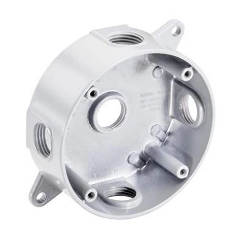 Topaz’s 4 in. 5-Hole Round Weatherproof Boxes in white are designed to use in multiple commercial and residential applications for wall or ceiling mounting. Meant for use with round outlet boxes and for lamp holder covers. Features a sleek premium powder coat finish and durable, long-lasting copper-free aluminum and has a 17.2 cu. in. capacity. The box includes 4 closure plugs, grounding screws and straightforward instructions for fast and easy installation. The threaded hubs are 1/2 an inch to fit your specific needs. This product is also both cULus Listed, UL Listed and both 2011 NEC and NEMA 3R compliant for safe use in wet environments.