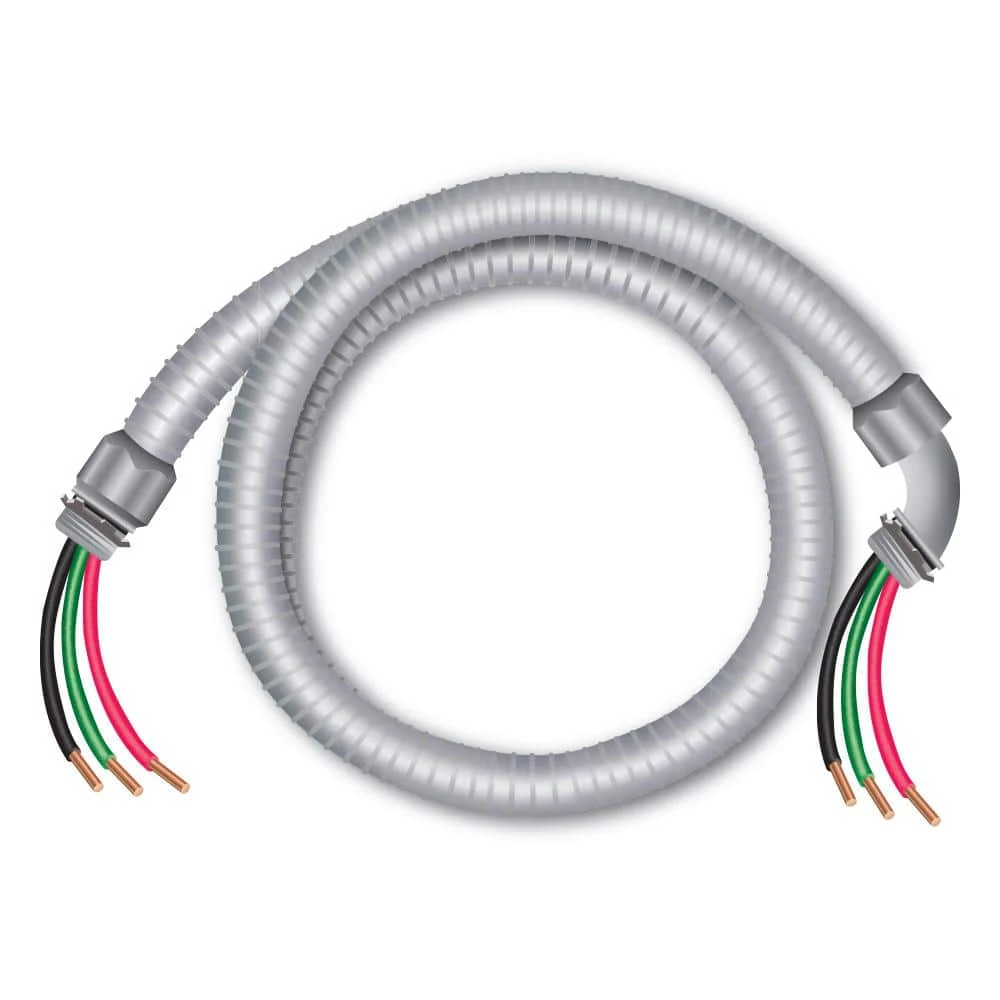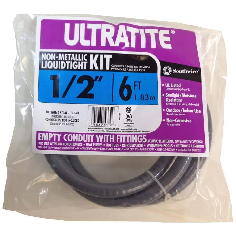 Southwire 1/2 in. x 6 ft. Liquidtite NM Kit. Resistant to rust, cracks and separation. It is made with non-metallic conduit with 2 different PVC materials that form the highly flexible product. A rigid material forms the stiff helical spring which is encapsulated by a second flexible compound.