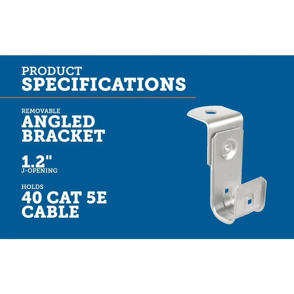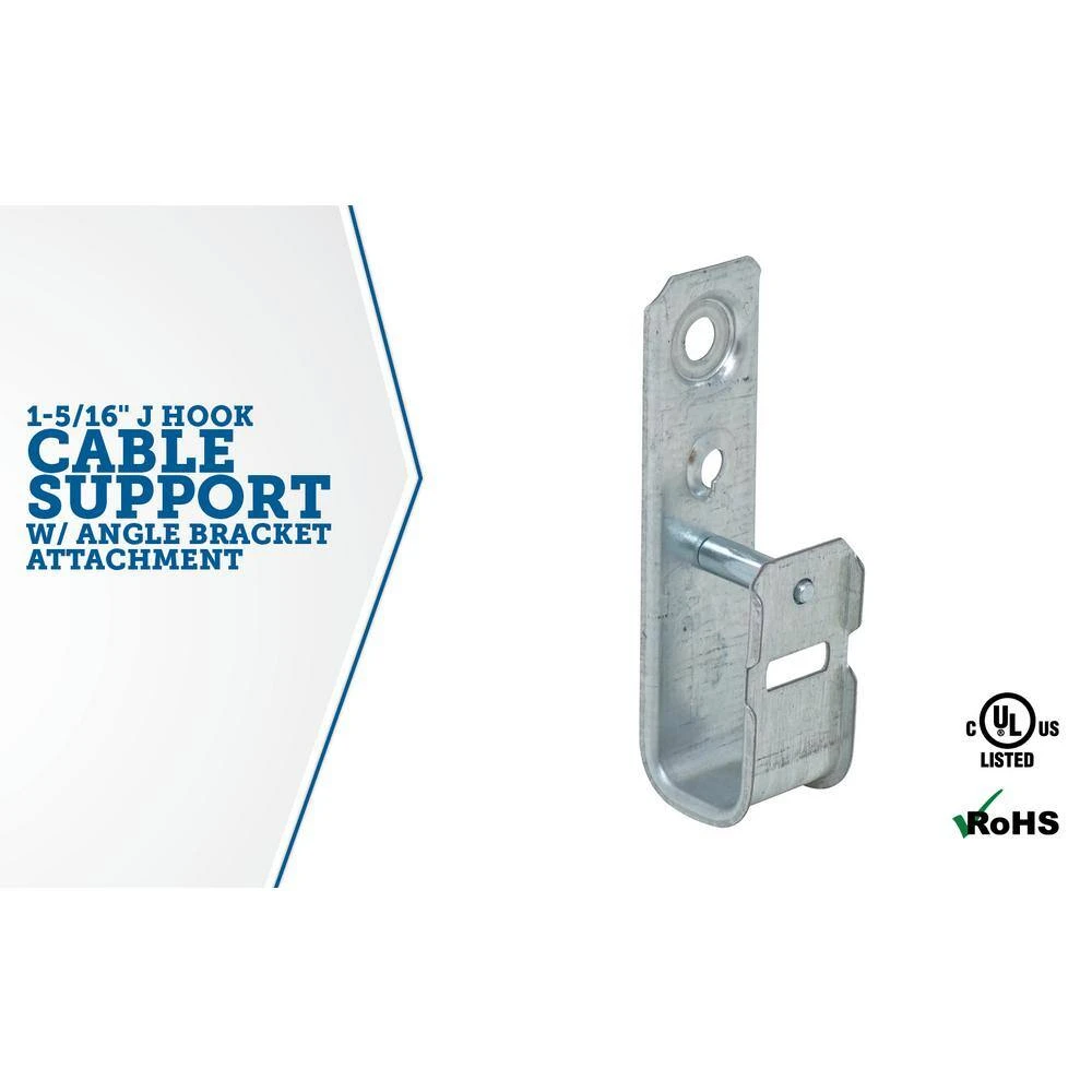 1-5/16 in J cable support hooks with an angle bracket attachment are versatile and can be attached to a wide variety of structures using beam clamps, clips and other support components available from Garvin Industries. These support hooks eliminate the problem of point loads that can cause band width damage to sensitive cables such as fiber optic, CAT 5E, 6, 7 or many others. Garvin Industries, a Southwire business J cable support hooks are an inexpensive alternative to cable trays. They provide support to sensitive voice and data cables without causing stress. Their continuous wide base radius design supports the natural bends and curves of cable. This J-Hook has a cable fill rate of 40 Cat5E cables. Retainer Clip Included. 50-pack.