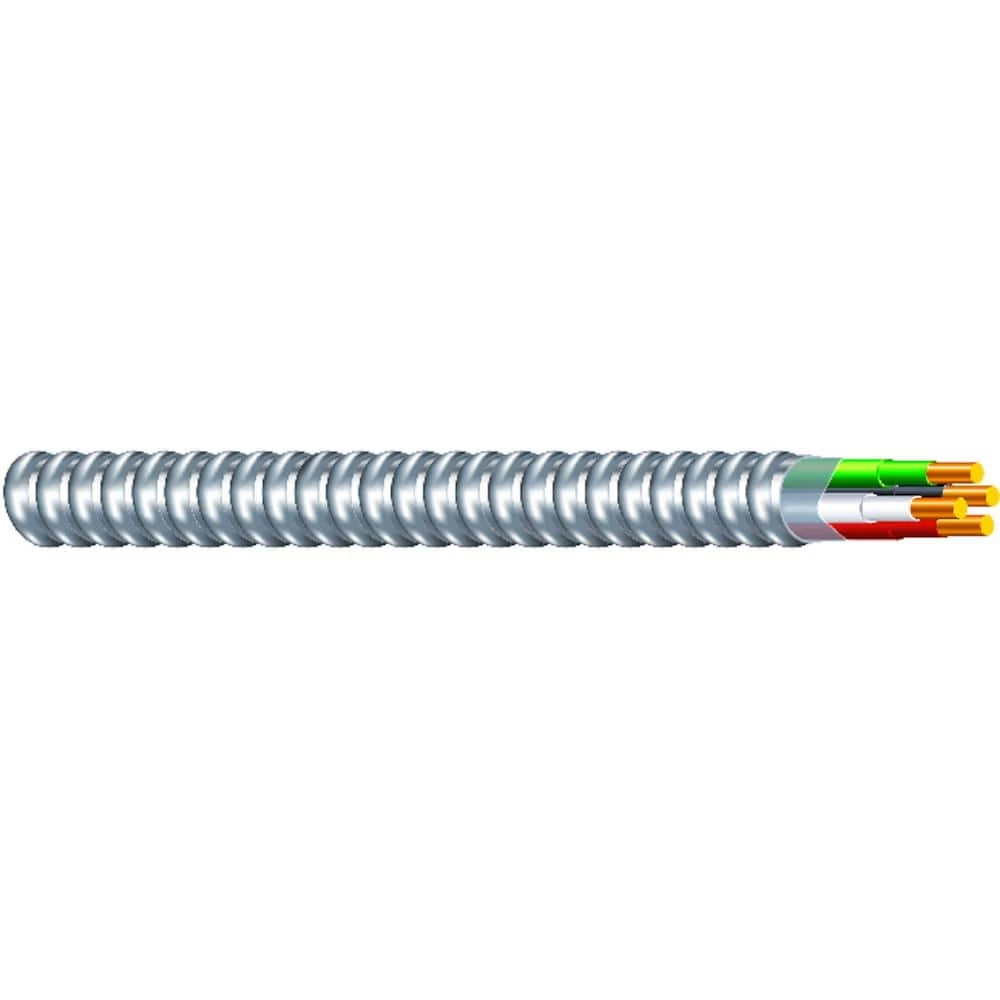 Southwire Armorlite Type MC Cable is constructed with soft-drawn copper, Type THHN/THWN conductors rated 90°C dry available in sizes 14 AWG through 2 AWG, and a green insulated grounding conductor. The conductors are cabled together and a binder tape bearing the print legend is wrapped around the assembly. Aluminum interlocking armor is applied over the assembly.