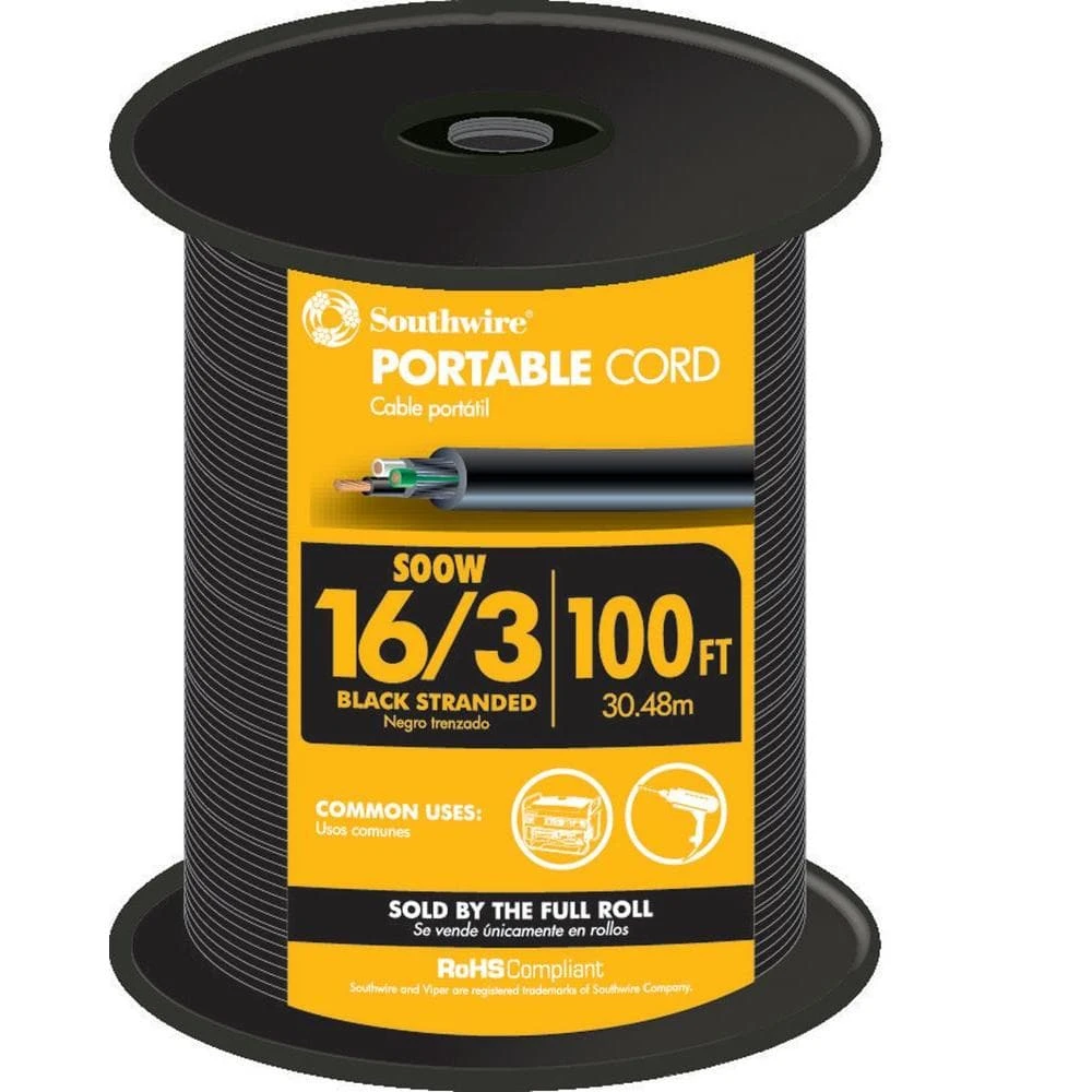 The Southwire 16/3 SOOW 100 ft. Black Flexible Cord is designed for indoor and outdoor use. The cord features flexible stranded copper conductors and an EPDM rubber insulation. It is excellent for a variety of hard usages, including marine and mining applications.