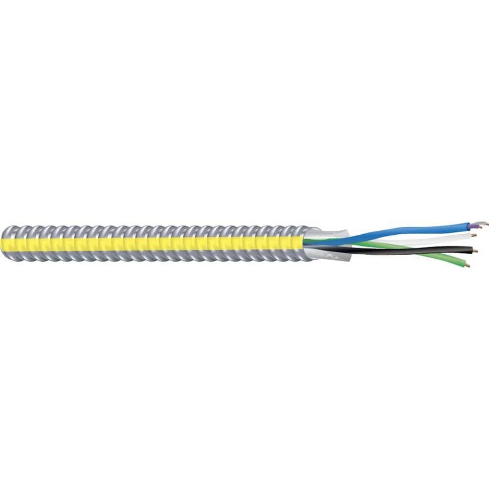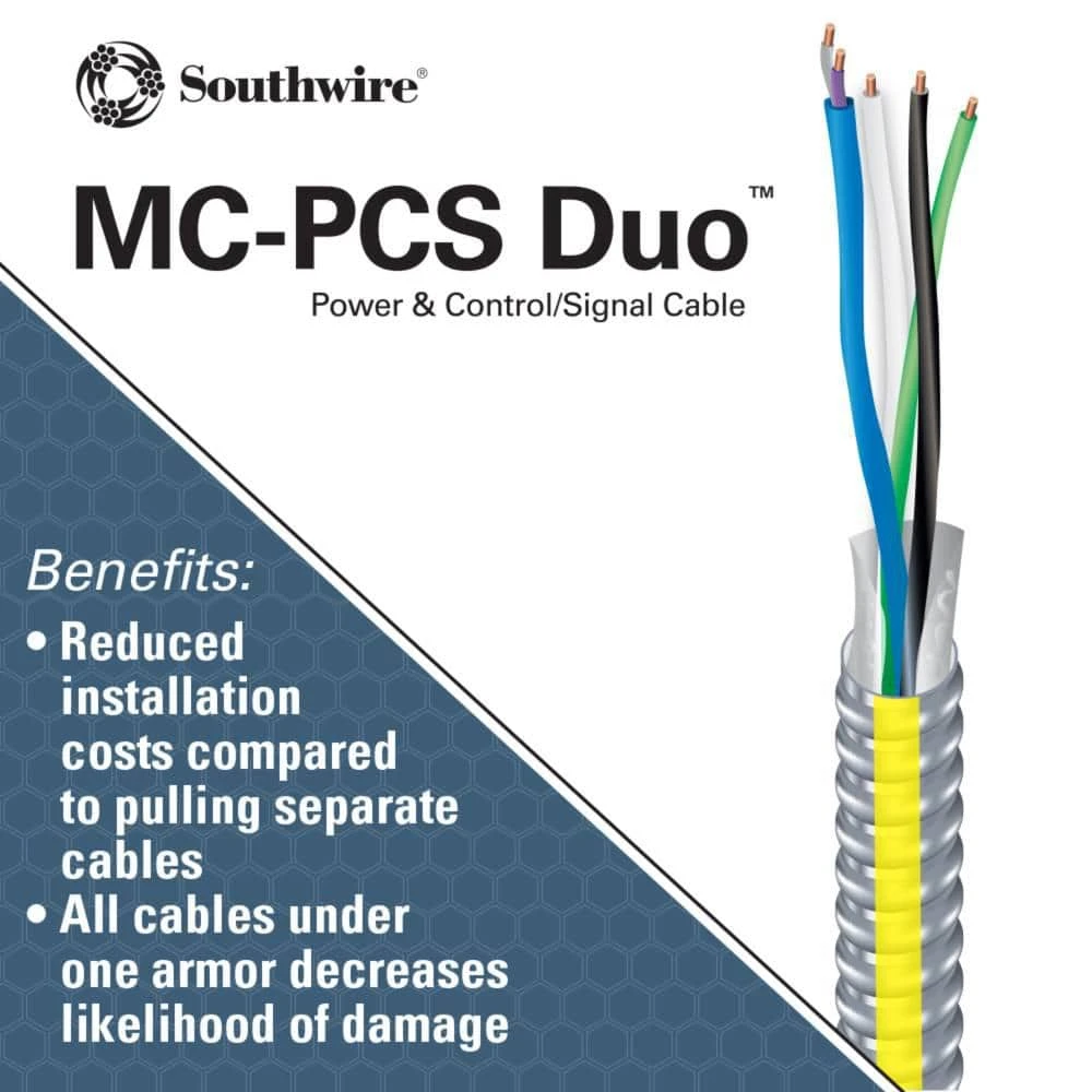 Southwires MC-PCS Duo is suitable for use as circuits for branch power distribution in commercial, industrial, institutional and multi-residential buildings as well as power, lighting, control and signal circuits. It works with LED lighting with 0-10V dimming. This cable is constructed with 12 AWG CU Type THHN/THWN power and ground conductors along with a control conductor assembly composed of a 30 mil PVC jacket covering two 16 AWG CU Type TFN control conductors. The phase conductors, ground and control conductor assembly are cabled together and a binder tape bearing the print legend is wrapped around the assembly. Aluminum interlocking armor is applied over the taped assembly. Yellow stripe/blocks are printed on the outside of the armor and the print legend is applied in black print on every 4th yellow stripe/block.
