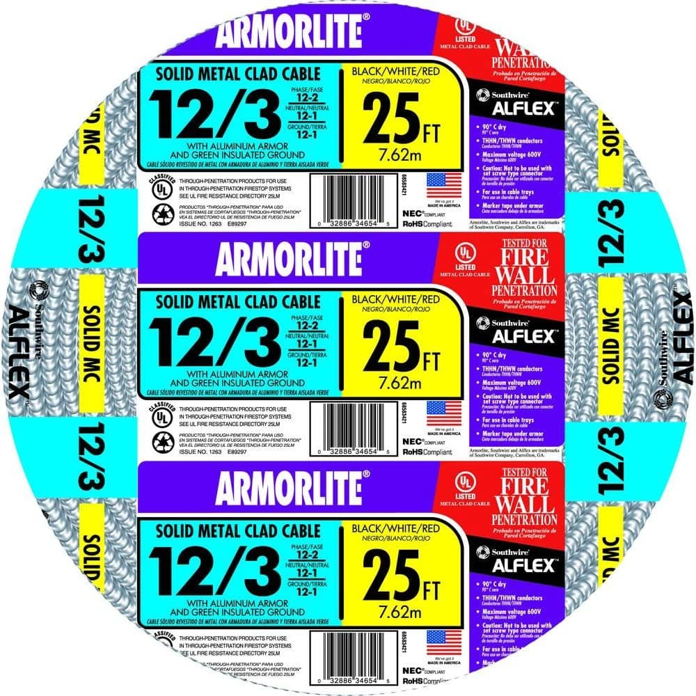 Southwire Armorlite Type MC Cable is constructed with soft-drawn copper, Type THHN/THWN conductors rated 90°C dry available in sizes 14 AWG through 2 AWG, and a green insulated grounding conductor. The conductors are cabled together and a binder tape bearing the print legend is wrapped around the assembly. Aluminum interlocking armor is applied over the assembly.
