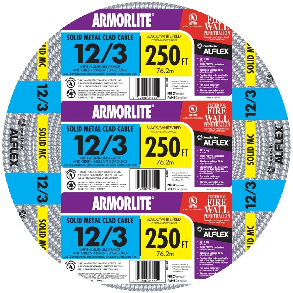 Southwire Armorlite Type MC Cable is constructed with soft-drawn copper, Type THHN/THWN conductors rated 90 degree C dry available in sizes 14 AWG through 2 AWG and a green insulated grounding conductor. The conductors are cabled together and a binder tape bearing the print legend is wrapped around the assembly. Aluminum interlocking armor is applied over the assembly.