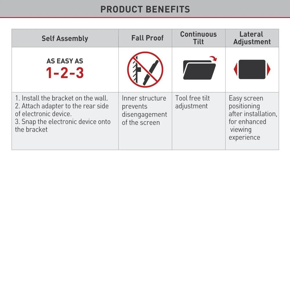 - Self Assembly – 1. attach adapter to the rear side of electronic device, 2. install the bracket on the wall, 3. snap the electronic device onto the bracket