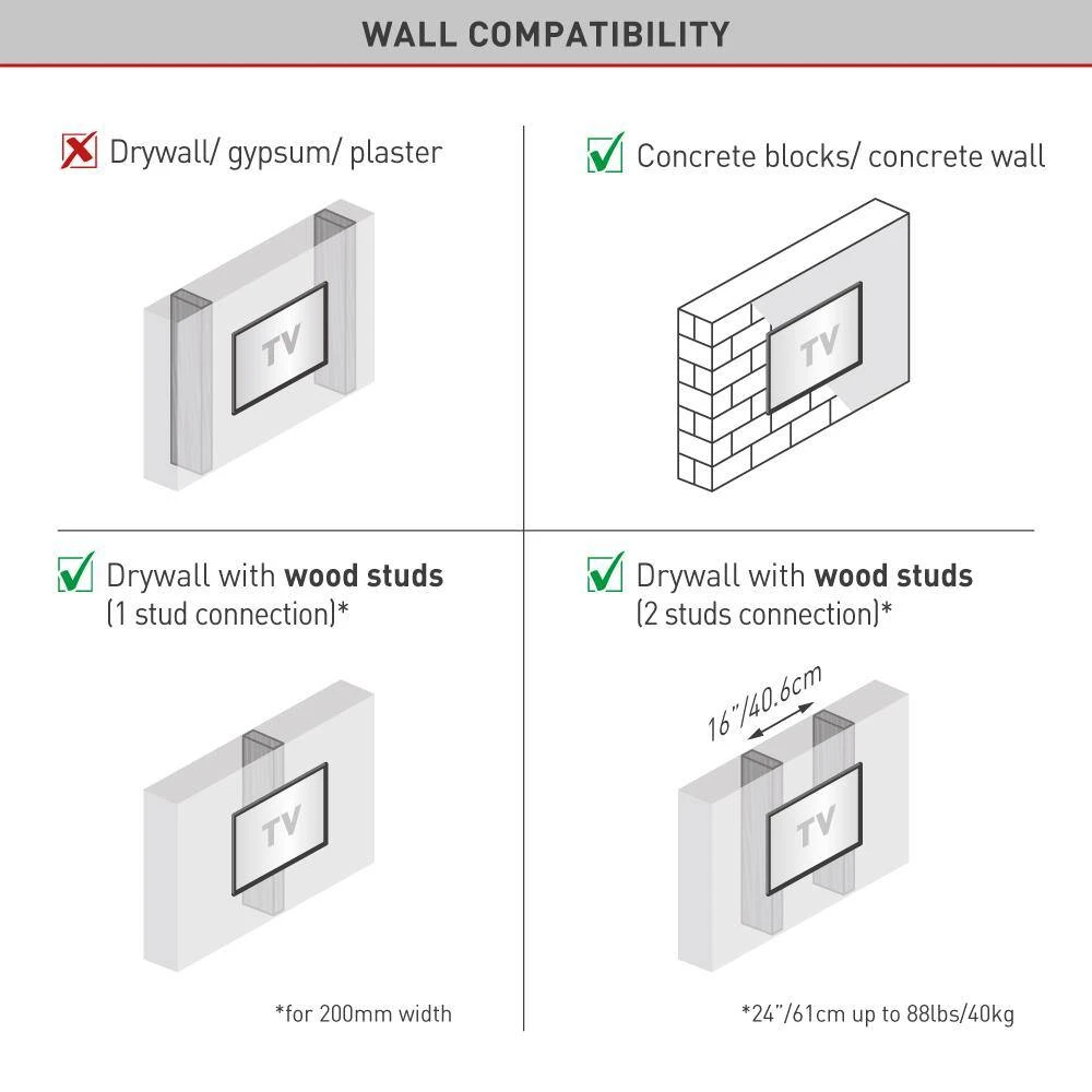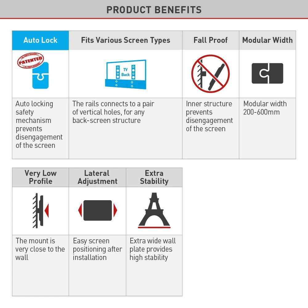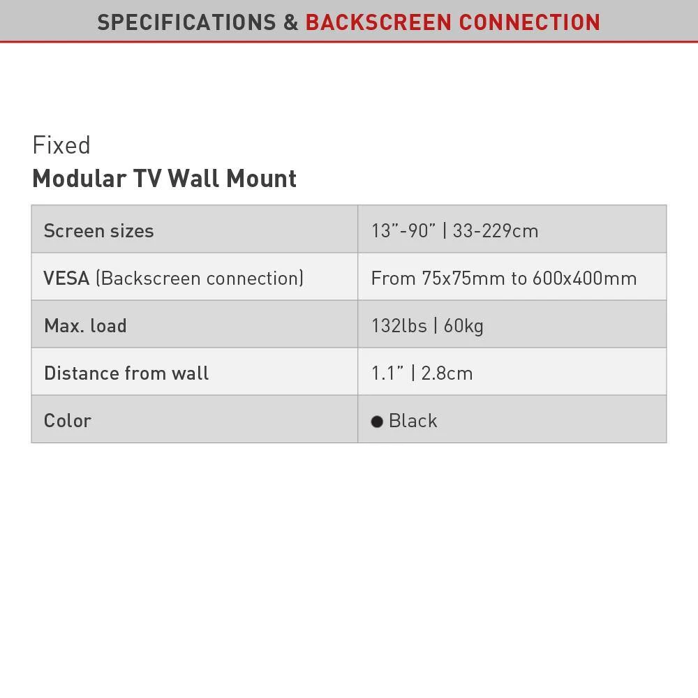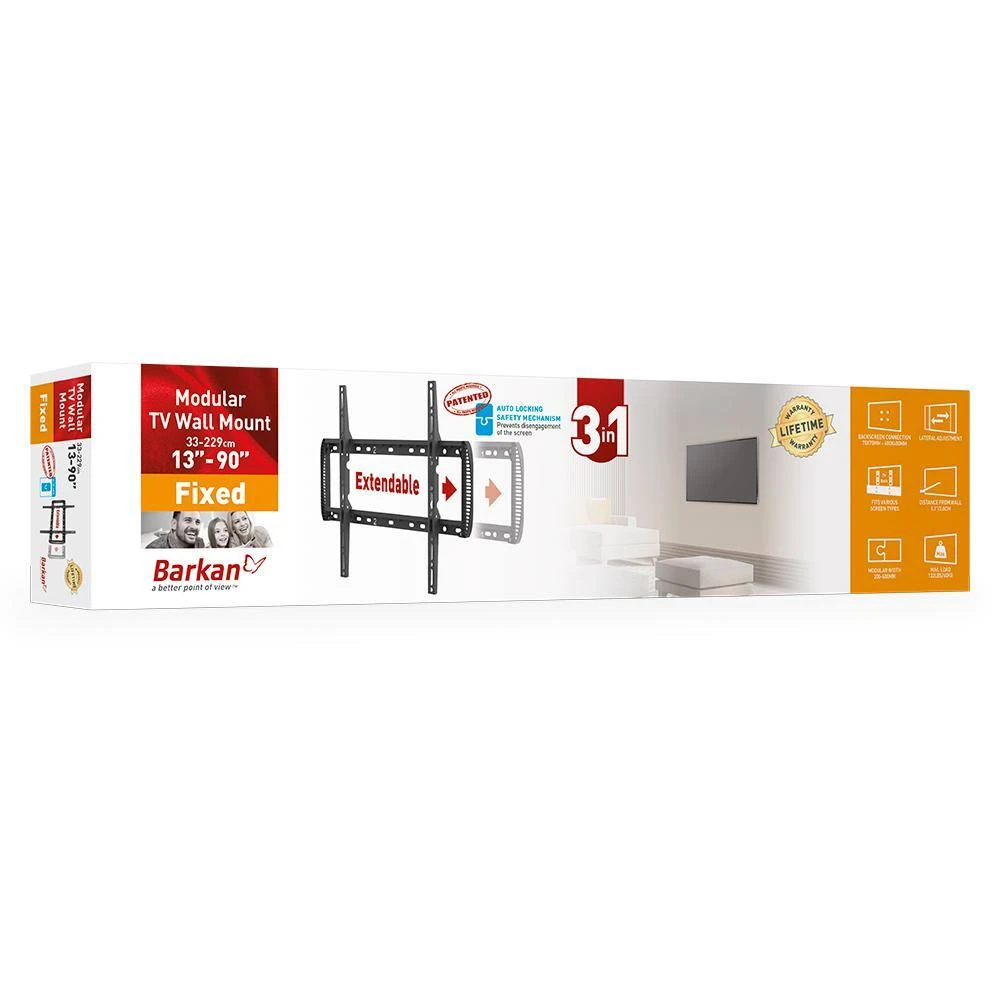 The Barkan fixed wall mount fits flat/curved screens sizes 13 in. to 90 in. and weight up to 132 lbs. The mount features a US and China patented auto-locking mechanism to prevent disengagement of the screen, with 2 hanging points in each side and without wires and moving parts that might break. The distance from the wall is only 1.2 in. The mount fits TVs with Vesa (Bracket Mounting Holes Patterns) and non Vesa. 3 modular connection options, according to the horizontal distance between the mounting holes (vertical distance up to 400 mm in all options): 1. Up to 200 mm 2. Between 200 mm and 400 mm 3. Between 400 mm and 600 mm The mount has a lifetime warranty and its col or is black. Please check the list of included screen-connection screws in the assembly instructions. If your screen requires different screen-connection screws.