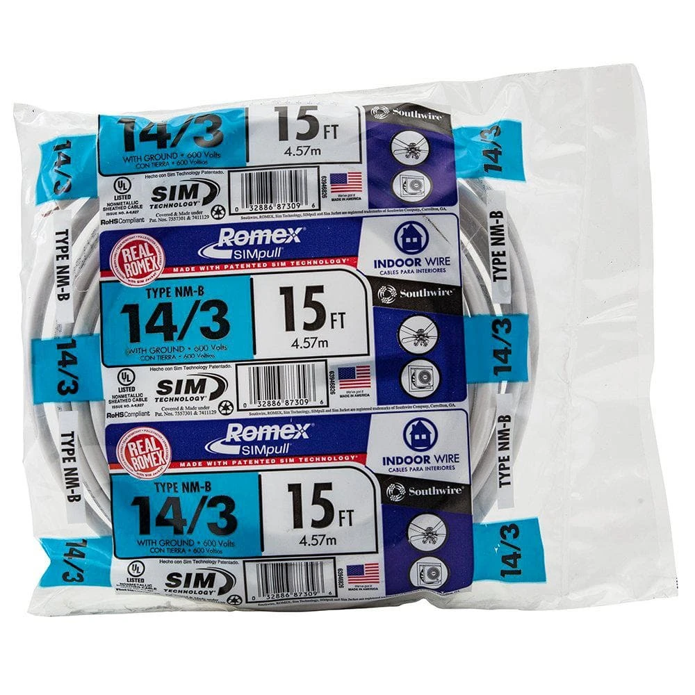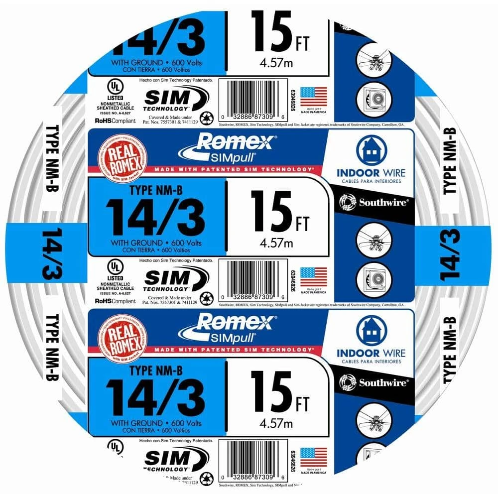 Wire residential indoor branch circuits for outlets, switches and other loads with Southwire Romex SIMpull Type NM-B Cable. SlikQuik jacket allows for 50% reduction in pulling force for easier installation. May be run in air voids of masonry block or tile walls not subject to excessive moisture and dampness.
