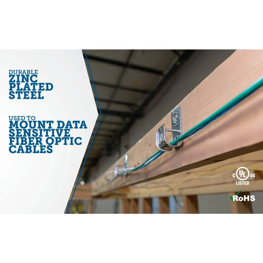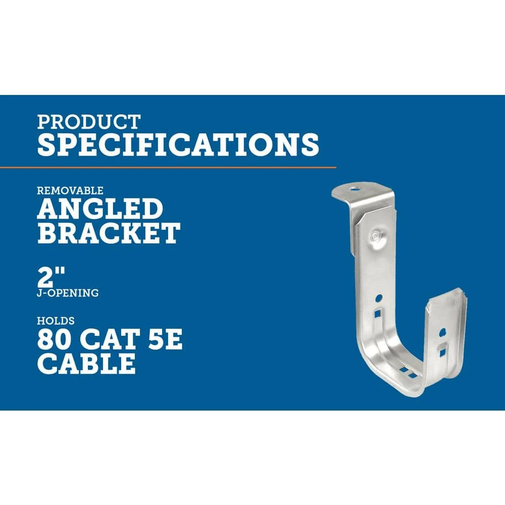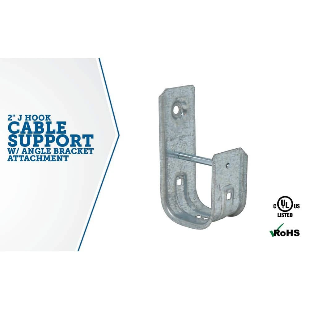 2 in J cable support hooks with an angle bracket attachment are versatile and can be attached to a wide variety of structures using beam clamps, clips and other support components available from Garvin Industries. These support hooks eliminate the problem of point loads that can cause band width damage to sensitive cables such as fiber optic, CAT 5E, 6, 7 or many others. Garvin Industries, a Southwire business 2 in J cable support hooks are an inexpensive alternative to cable trays. They provide support to sensitive voice and data cables without causing stress. Their continuous wide base radius design supports the natural bends and curves of cable. This J-Hook has a cable fill rate of 80 Cat5E cables. Retainer Clip Included. 50-pack.