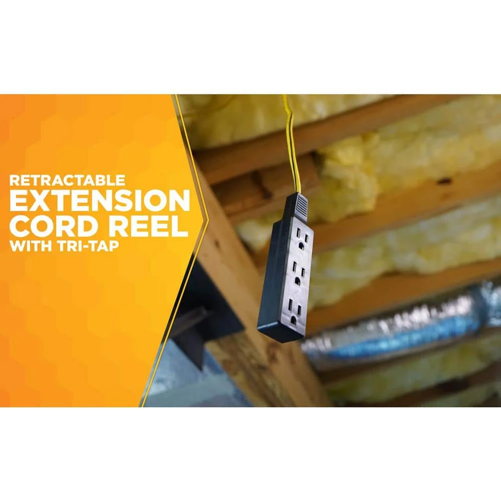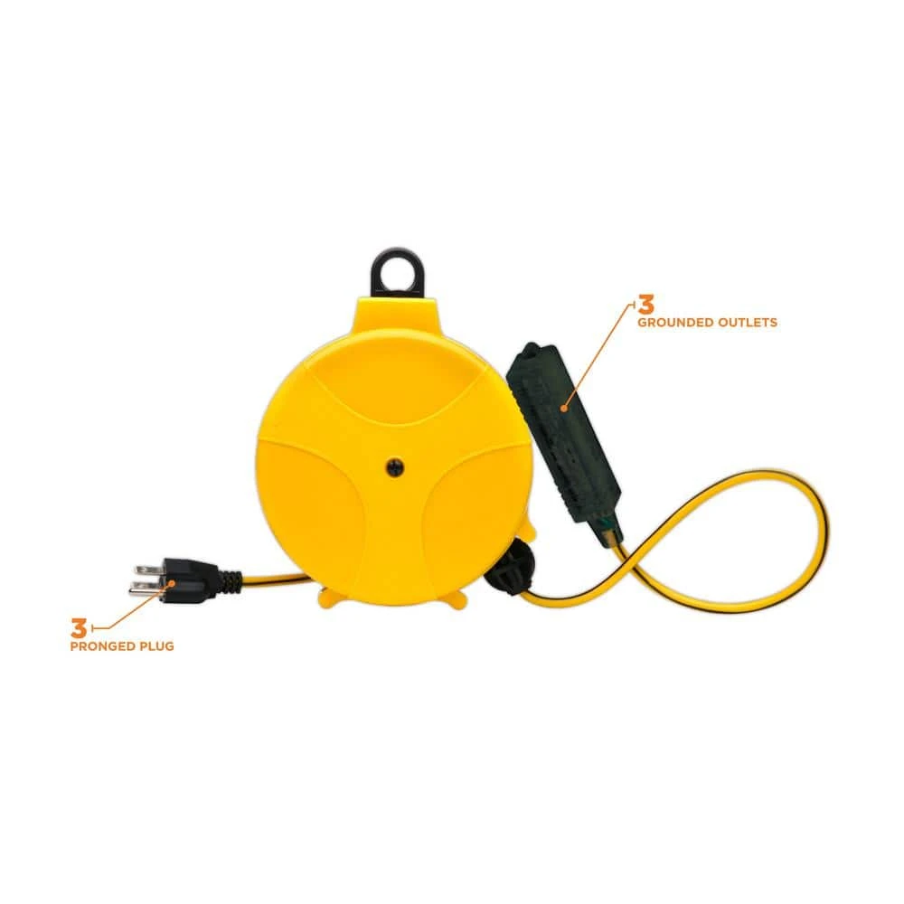 Great for use in any garage or workshop. This cord reel has 20 ft. of cord neatly stored inside a durable retractable cord reel. Keep this fixture mounted on your ceiling or wall and bring power to any corner of your work space without the tangled mess of regular extension cords.