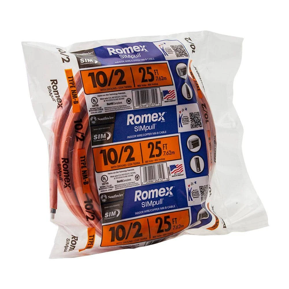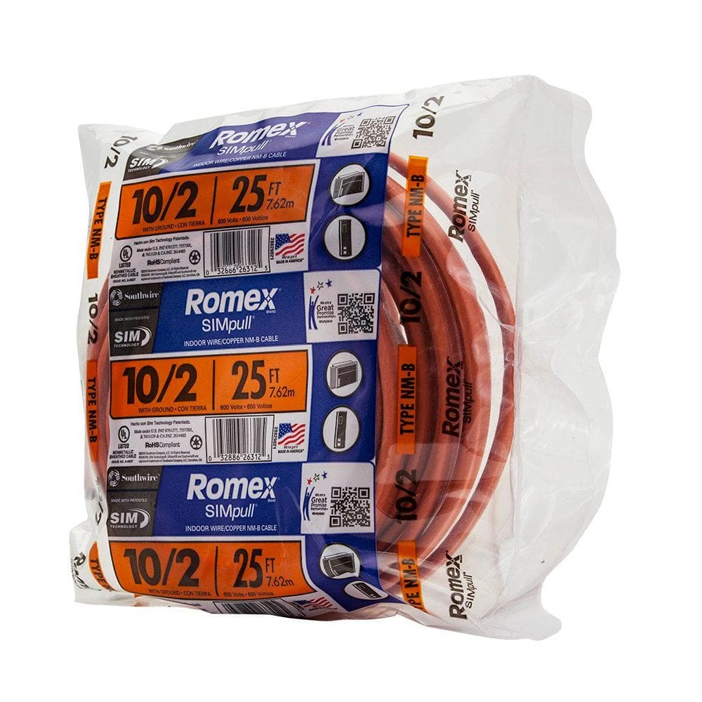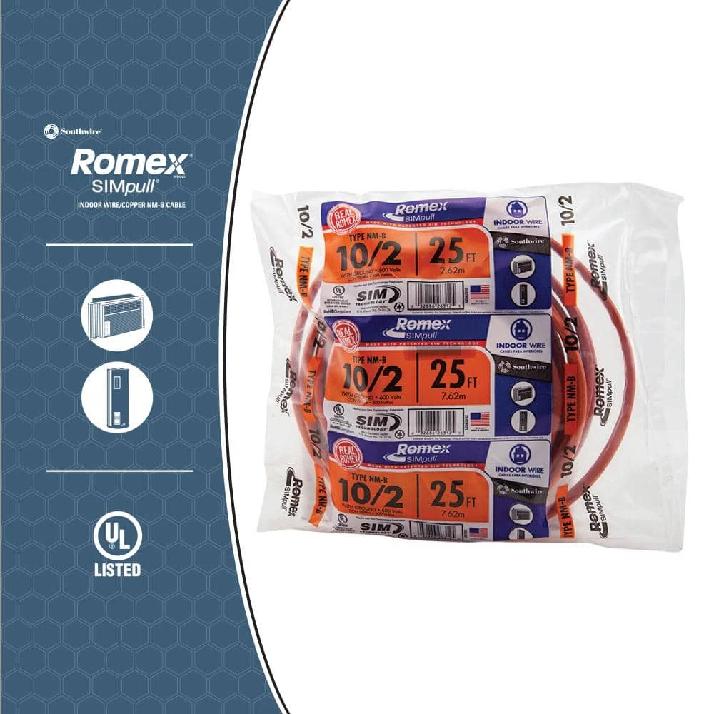 The Romex SIMpull 25 ft. 10/2 NM-B Wire is a solid wire suitable for use in interior residential applications. The SIM Technology jacket offers easy pulling. UL listed.