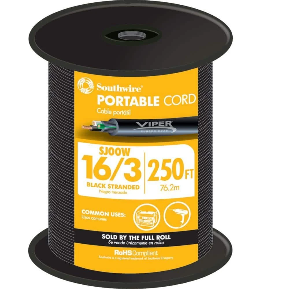 With a tissue-paper conductor wrapping, the Southwire 250 ft. Black 16/3 300-Volt Rubber Cord features an easily removable jacket. This cord is ideal for wiring portable tools, appliances, equipment and small motors. This rubber cord is rated at -40 degree Celsius to +90 degree Celsius.