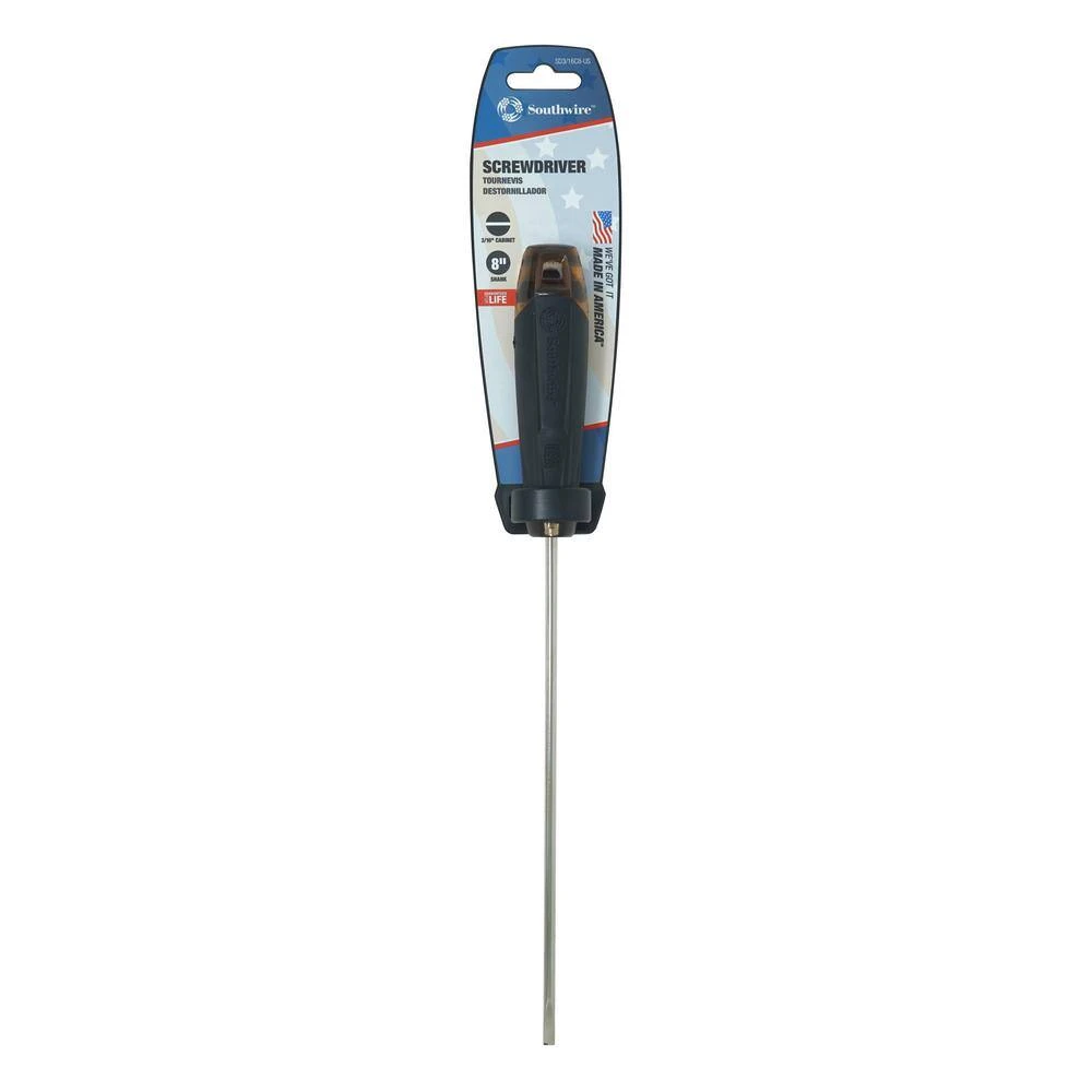 Southwire is proud to introduce our line of all Made in America drivers. The USA cabinet tip screwdriver has a 3/16 in. cabinet tip and 8 in. shank. The cushion grip handle allows for maximum torque and comfort. This driver has a 22% larger cushion grip handle that provides ultimate comfort and maximum torque as compared to previous generations. The corrosion-resistant shank ensures durability to withstand damaged, allowing for a longer life. This screwdriver comes with high quality, precision machined tips for an exact fit.