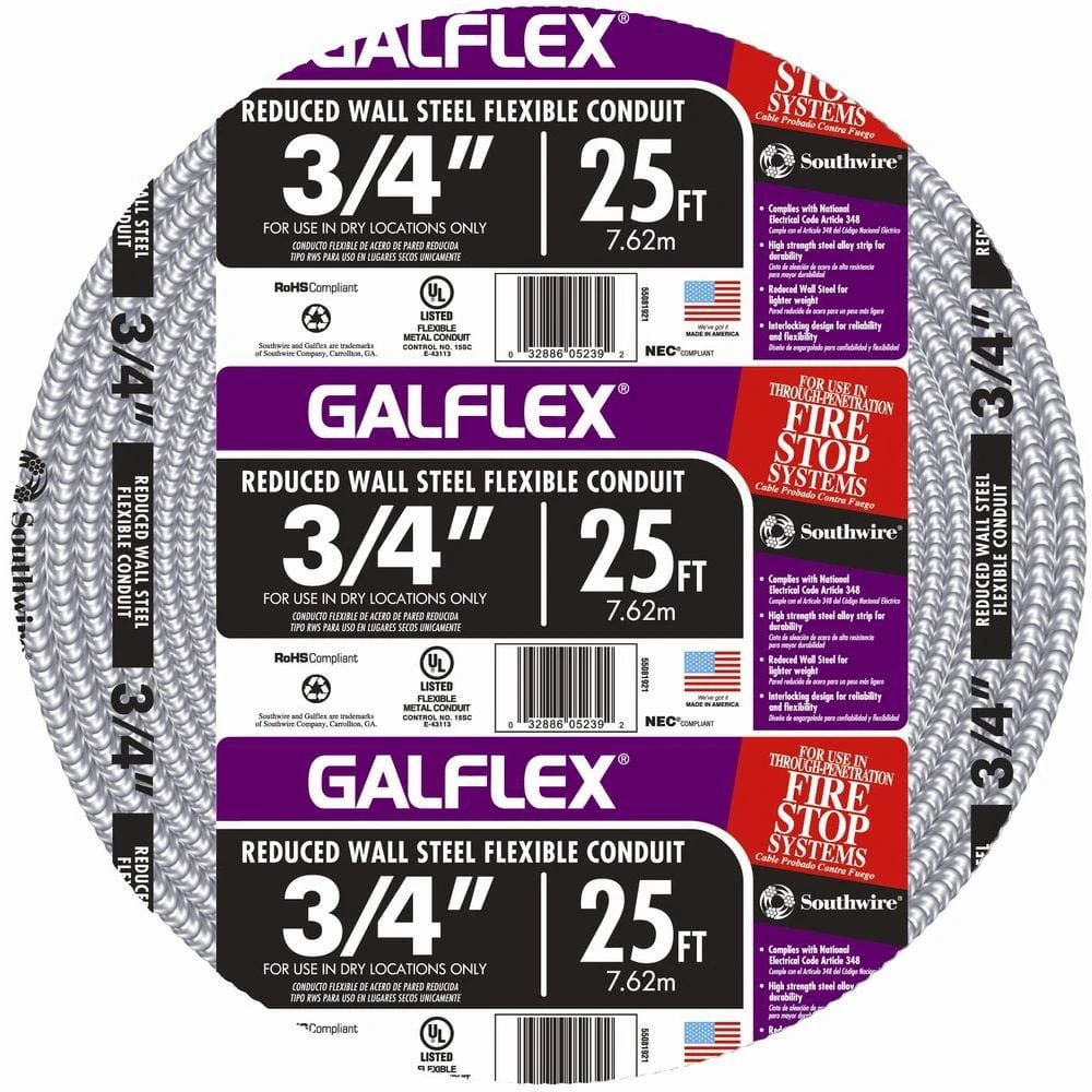 This 3/4 in. x 25 ft. Flexible Steel Conduit can be used for motor feeders, branch, control circuits, cables, elevators, escalators, cranes, hoists and electric signs. NEC type designation. UL and CSA listed.