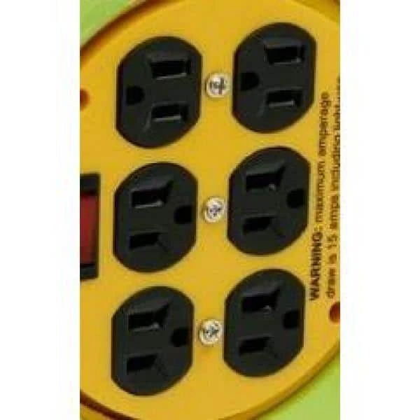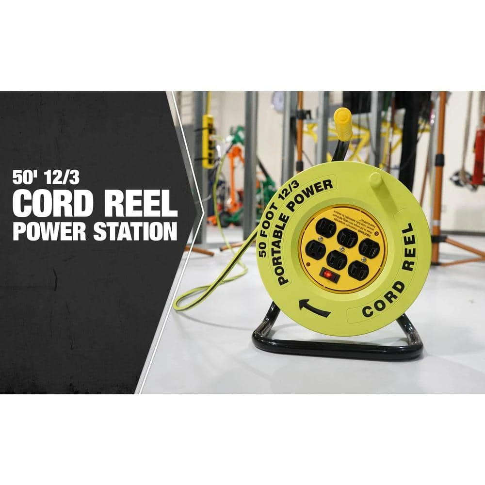 The 12/3-Gauge 50 ft. Cord Reel Power Station offers 50 in. of portable power and keeps your workstation organized. This reel features (6) grounded outlets, an on/off switch and a light-up power display. The 12-Gauge, 50 ft. cord is green and black with a safety stripe for improved visibility. The yellow handle provides easy portability and the hand wind knob allows for tangle free, easy winding of your power cord. This reel measures 12 in. H x 15.5 in. W x 7.5 in. L and weighs 10.4 lbs.
