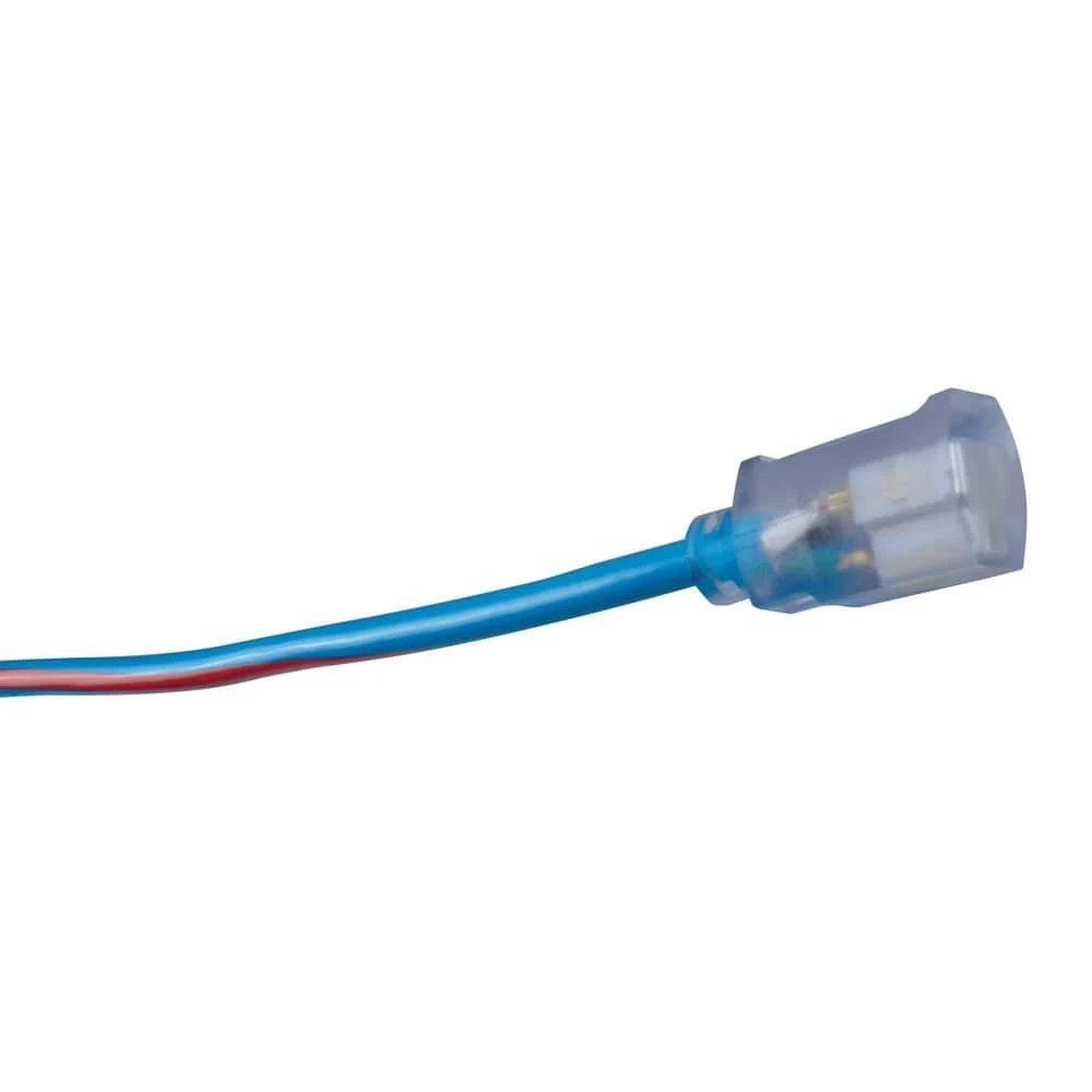 The Outdoor 50 ft. Extension Cord is designed with a red stripe for safety and prevents job-site loss. This vinyl insulated cord resists oil, grease, moisture, abrasion and prolonged exposure to sunlight. Heavy duty molded-on plugs and connectors. The power indicator light glows when the cord has power. The Outdoor 50 ft. Extension Cord is UL listed and comes with a 1-year limited warranty that protects against defects in material and workmanship.