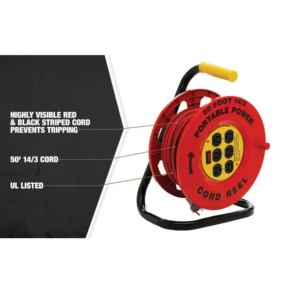 All in one 50 ft. extension cord and reel with 6 outlets brings the power to you. This 14/3 cord can handle all your power needs. Built in cord reel makes clean up and storage easy.