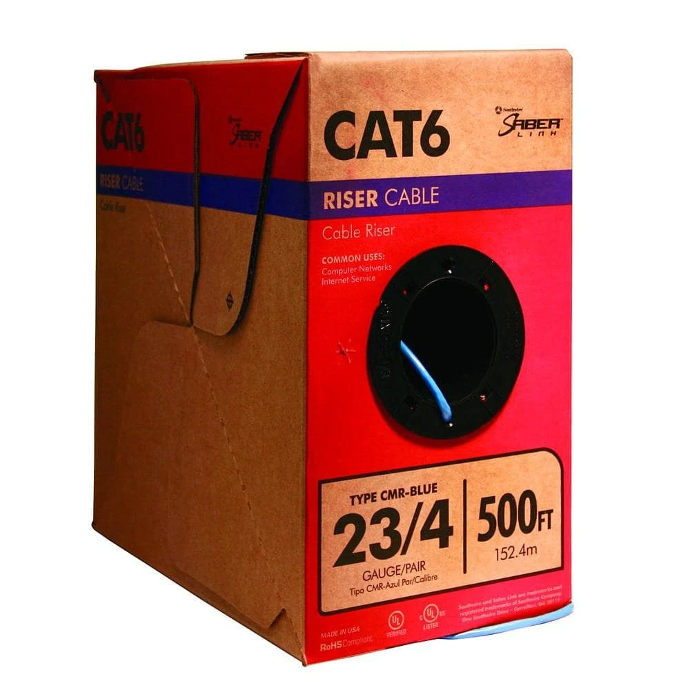 The 500 ft. Blue 23/4 CAT6 CMR Riser Cable is rated for use in walls and under raised floors, allowing versatile indoor applications for computer network & data wiring. The cable features CAT6 twisted pairs and is flame retardant for safe, long-lasting use. Made with insulation and a PVC jacket.