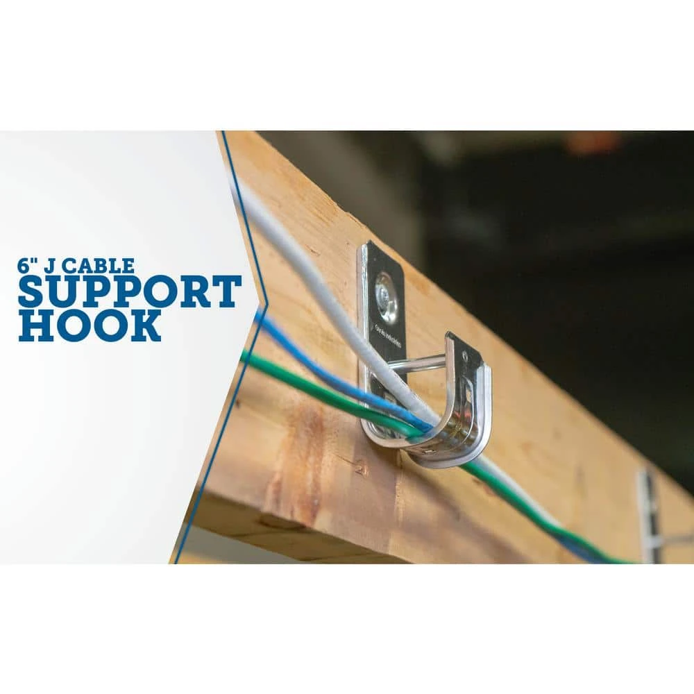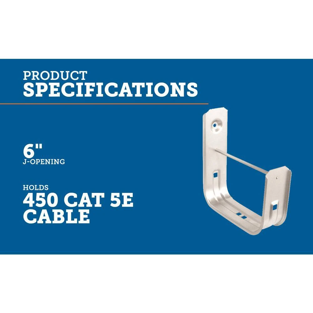 6 in J cable support hooks are versatile and can be attached to a wide variety of structures using beam clamps, clips and other support components available from Garvin Industries. These support hooks eliminate the problem of point loads that can cause band width damage to sensitive cables such as fiber optic, CAT 5E, 6, 7 or many others. Garvin Industries, a Southwire business J cable support hooks are an inexpensive alternative to cable trays. They provide support to sensitive voice and data cables without causing stress. Their continuous wide base radius design supports the natural bends and curves of cable. This J-hook has a cable fill rate of 450 Cat5E cables. Retainer Clip Included.