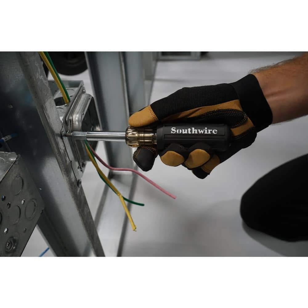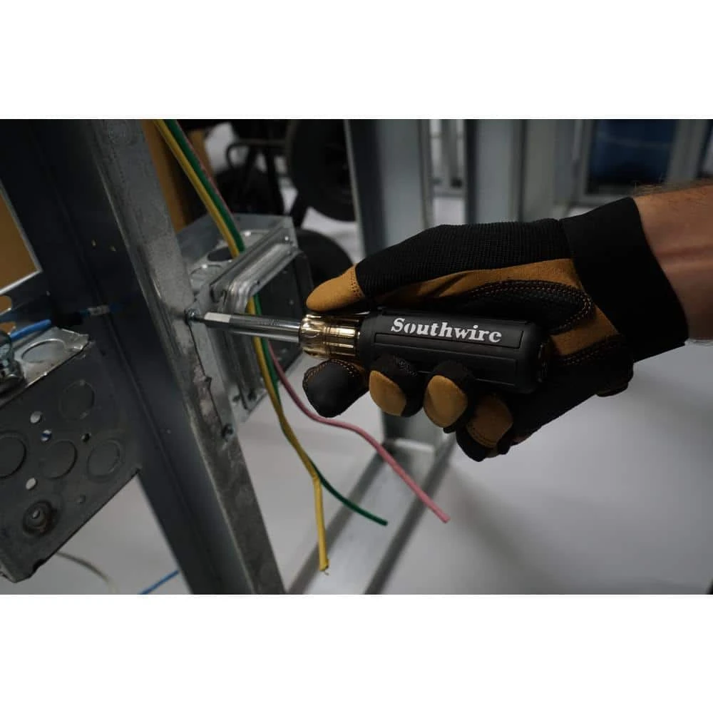 Interchangeable screwdriver with 3/16 in., 1/4 in. Slotted; #1, #2 Phillips; #1,#2 Square Recessed; and, 1/4 in., 5/16 in., 3/8 in. Hex Driver. Southwire’s 9-N-1 Multi-tool Screwdriver provides ample force to get the job done. Six bit sizes and 3 nut driver sizes will help you work quickly and efficiently without overloading your tool pouch.