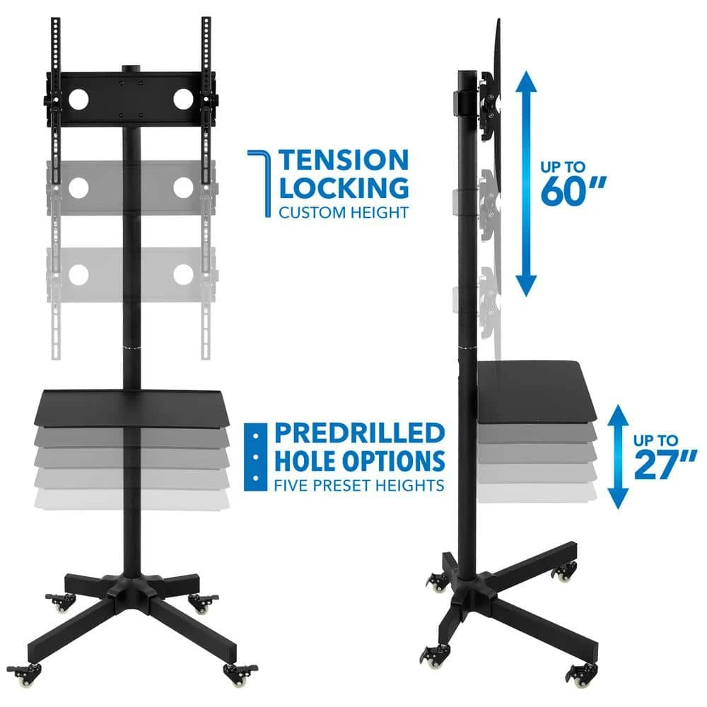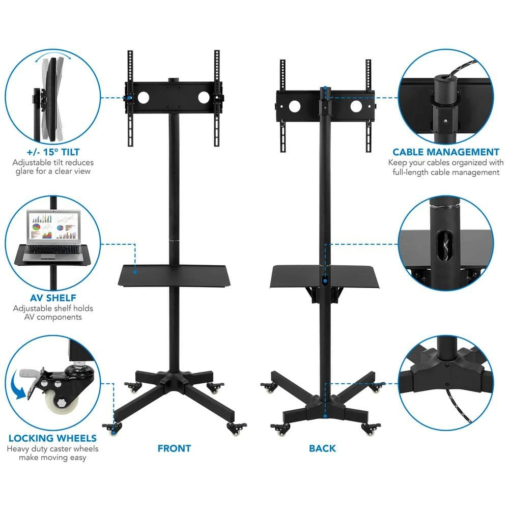 The mobility of the MI-1876 makes it easy to create the ultimate viewing experience in any situation and makes it ideal for home and commercial use, including schools, conference rooms, hospitals and backyards. The storage shelf easily holds any AV equipment including cable boxes, laptops, gaming consoles and blu ray players. The height-adjustable feature allows for all members of a crowded conference room or classroom to have an exceptional viewing experience.