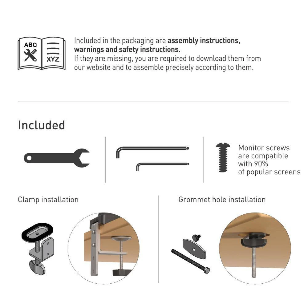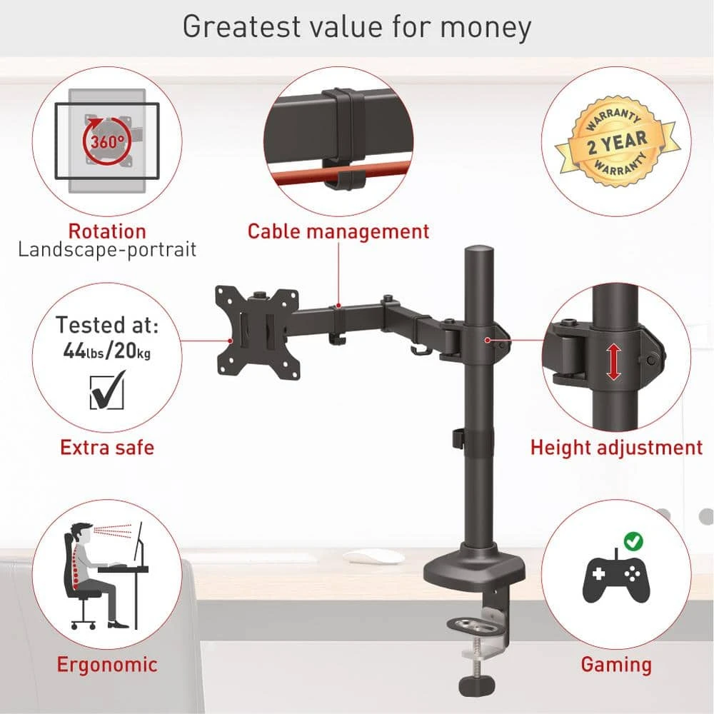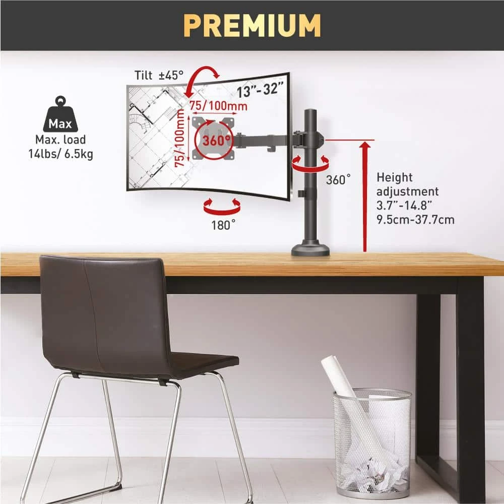 The Barkan full motion desk mount fits flat/curved monitors sizes 13 in. to 32 in. and weight up to 14 lbs. The minimum distance from the desk is 3.7 in. and the maximum distance is 14.8 in. The mount assures wide movement range to reach ergonomic viewing position. Movement options allow vertical adjustment, rotating 360°, folding, swivel near the screen connection plate 180° and a 90° tilt. It fits monitors with VESA standard (Bracket Mounting Holes Patterns) 75 x75 and 100 mm x 100 mm. Quick and easy assembly to surfaces 0.4-2.7 in. thick without drilling. The mount has a 2-year warranty and its color is black. If you are satisfied with the product, please leave a review. If you are not satisfied please contact us, we will solve the problem for you.