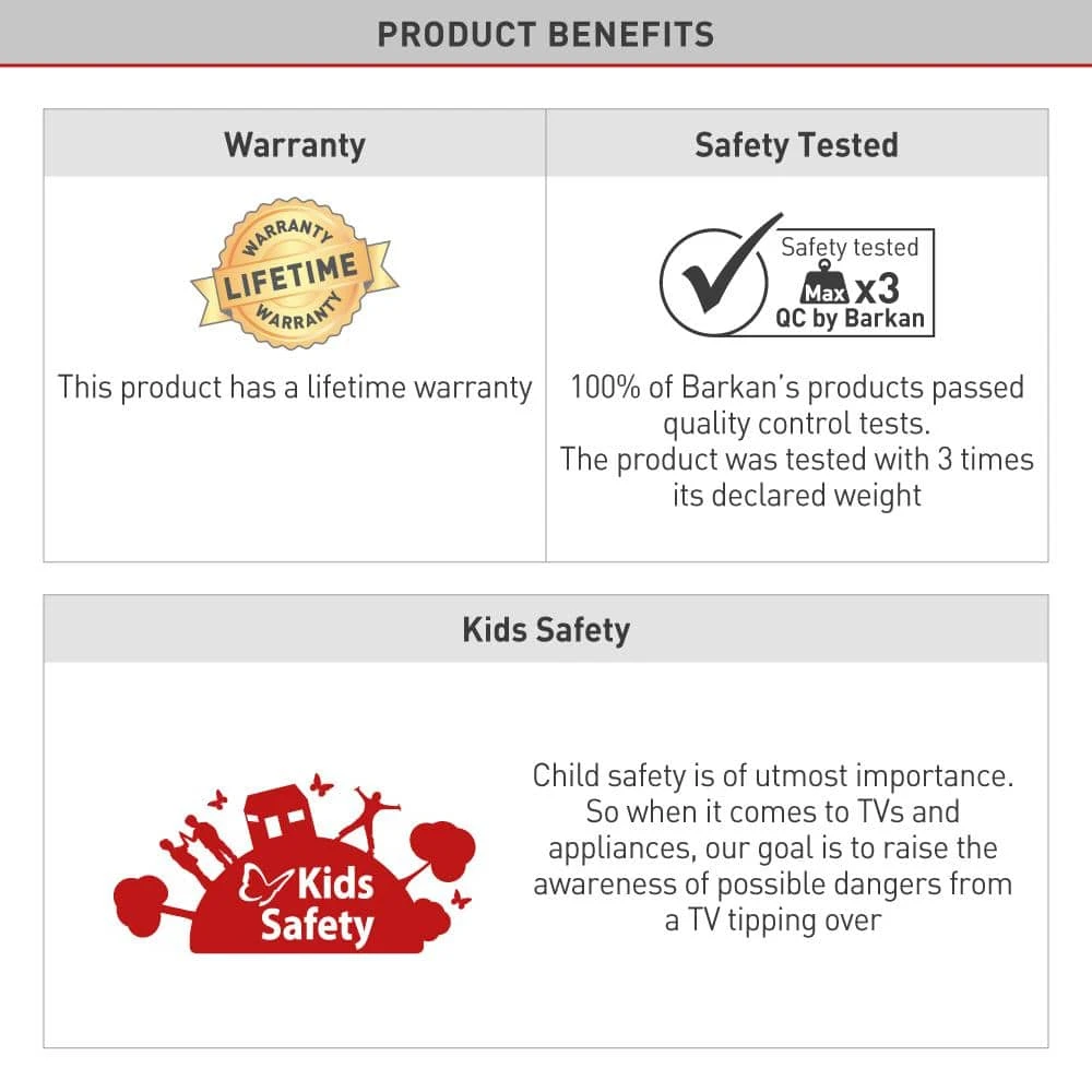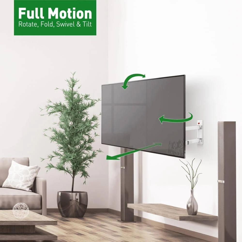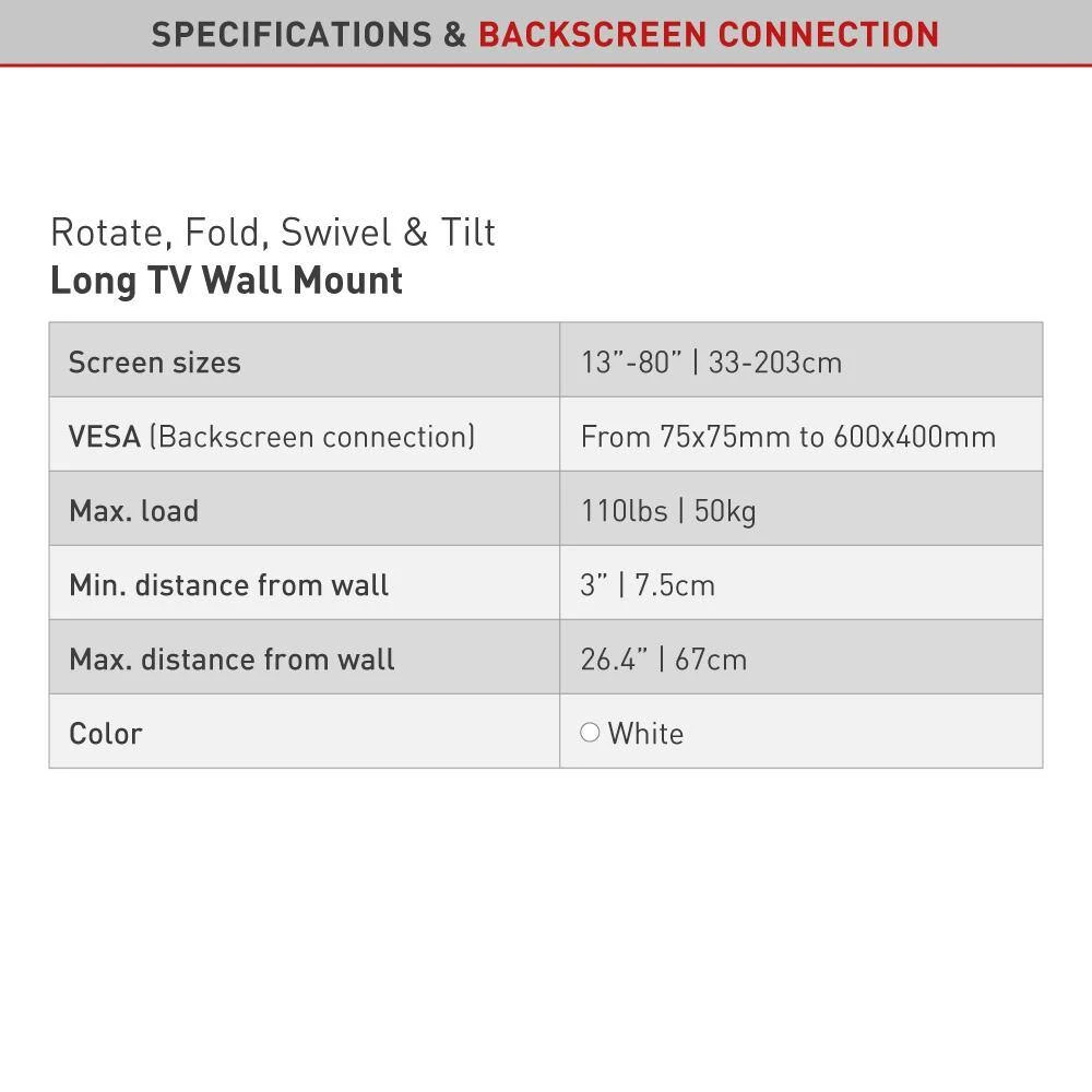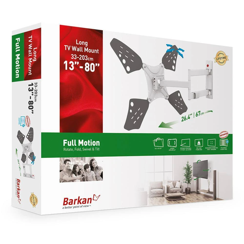The Barkan full motion, 4 – movement TV mount with rotate, fold, swivel and tilt options fits flat / curved screens sizes 13 – 80 inches and weight up to 110lbs. The minimum distance between the mount and the wall is only 3 in. and the maximum distance is 26.4 in. which allows 90 degree swivel for screens up to 52 in. (width up to 47.2 in.). It is extremely extendable in open position therefore allows viewing from a variety of places and locating the screen around the corner of a wall. In closed position provides low profile mounting. It fits TVs with VESA standard (Bracket Mounting Holes Patterns) 75×75, 100×100, 100×200, 200×100, 200×200, 300×300, 300×400, 400×200, 400×300, 400×400, 600×400 mm and non VESA up to 600×400 mm. In order to offer a better point of view, the mount has three pivots: near the wall 180 degrees, foldable 360 degrees, swivel near the screen connection plate 180 degrees and also tool free tilt from 0 till 10 degrees. The mount has a lifetime warranty and its color is white. Please check the list of included screen-connection screws in the assembly instructions. If your screen requires different screen-connection screws, please purchase them in your local hardware store or consult us at [email protected]. Please make sure to follow the assembly instructions. **If you are satisfied with the product, please leave a review. If you are not satisfied please contact us at https://www.barkanmounts.com/support and we will solve the problem for you**