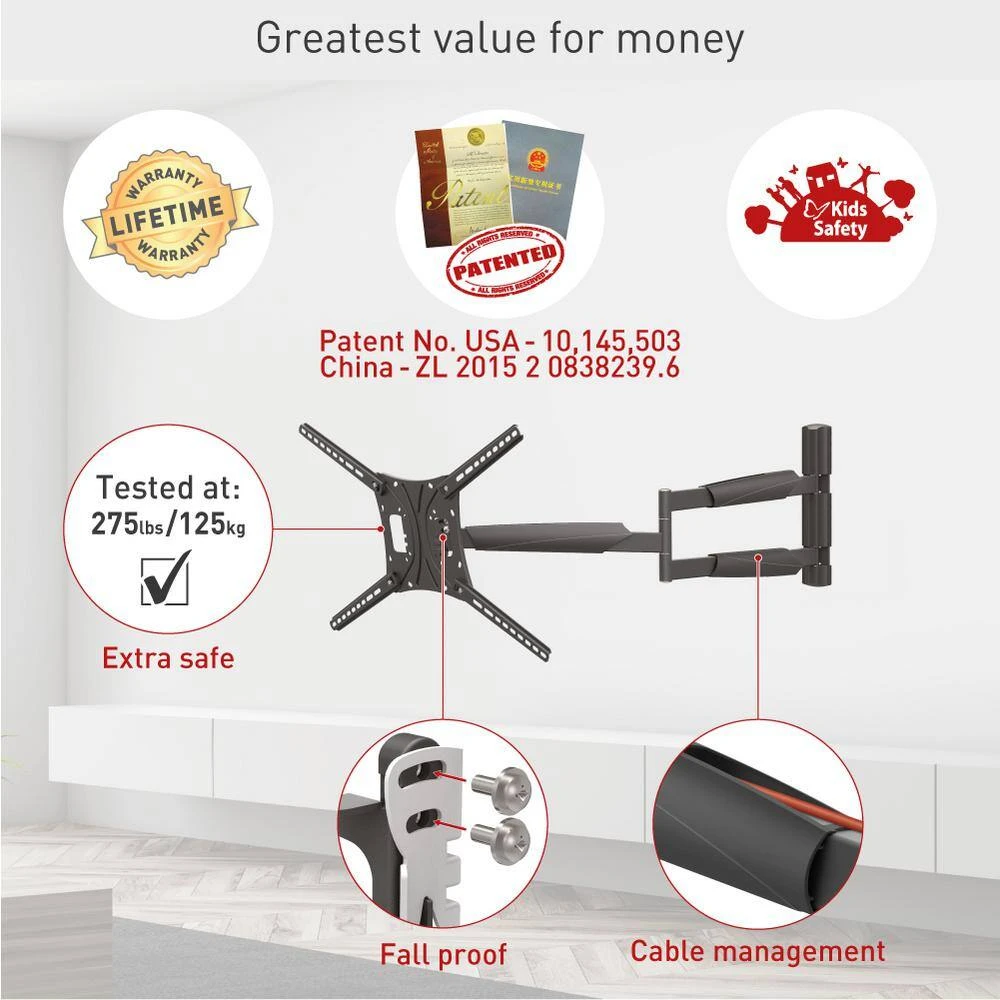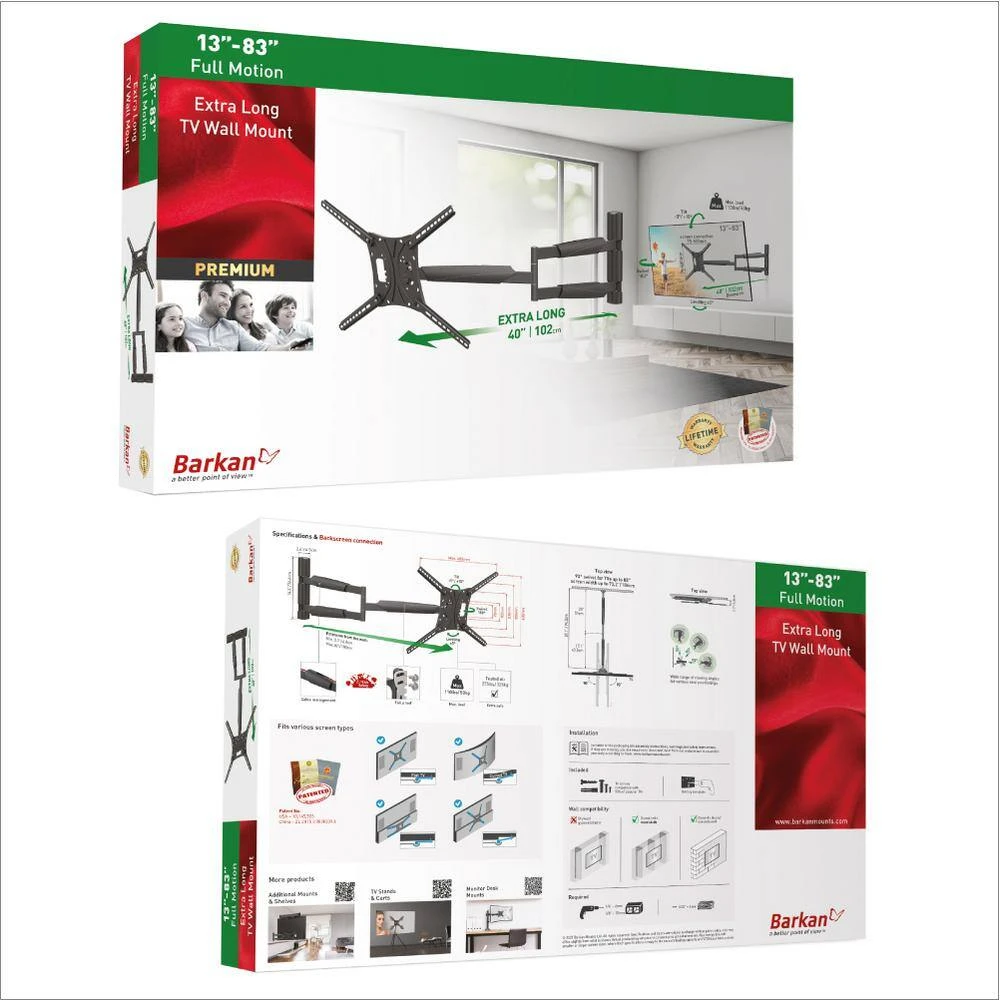 The Barkan full motion, 4 – movement TV mount with rotate, fold, swivel and tilt options fits screens sizes 13 in. to 83 in. and weight up to 110 lbs. The minimum distance between the mount and the wall is only 2.7 in. and the maximum distance is 40 in. which allows 90° -swivel for screens up to 83 in. (width up to 75.6 in.) It is extremely extendable in open position therefore allows viewing from a variety of places and locating the screen around the corner of a wall. In closed position provides low profile mounting. It fits TVs with VESA standard (Bracket Mounting Holes Patterns) 75×75, 100×100, 100×200, 200×100, 200×200, 200×300, 300×300, 300×400, 400×200, 400×300, 400×400, 400×600, 600×300, 600×400 mm and non VESA up to 600×400 mm. In order to offer a better point of view, the mount has 3 pivots: near the wall 180°, foldable 360°, swivel near the screen connection plate 180° and also tool free tilt from -5 till 15°. The mount has a lifetime warranty and its color is black. Please check the list of included screen-connection screws in the assembly instructions. If your screen requires different screen-connection screws, please purchase them in your local hardware store. Product installation – please make sure to follow the assembly instructions precisely. If you are satisfied with the product please leave a review. If you are not satisfied please contact us and we will solve the problem for you.