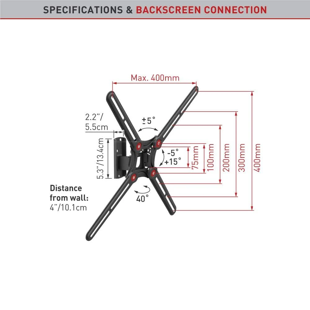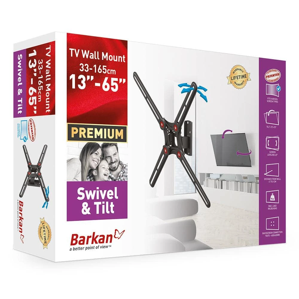 The Barkan 2 – movement TV mount with swivel and tilt options fits flat/curved screens sizes 13 in. to 65 in. and weight up to 88 lbs. The distance between the mount and the wall is 4 in. It fits TVs with VESA standard (Bracket Mounting Holes Patterns) 75 mm x 75 mm, 100 mm x 100 mm, 100 mm x 200 mm, 200 mm x 100 mm, 200 mm x 200 mm, 300 mm x 300 mm, 300 mm x 400 mm, 400 mm x 200 mm, 400 mm x 300 mm, 400 mm x 400 mm and non VESA up to 400 mm x 400 mm in order to offer a better point of view, the mount has a 40° swivel near the screen connection plate in addition to a tool free tilt from minus 5 till 15°. The mount has a lifetime warranty and its color is black. Please check the list of included screen-connection screws in the assembly instructions. Certain Samsung TVs require M8 x 1-3/4 in./45 mm screws (not included). If your screen requires different screen-connection screws, please purchase them in your local hardware store or consult us. If you are satisfied with the product, please leave a review. If you are not satisfied please contact us we will solve the problem for you.
