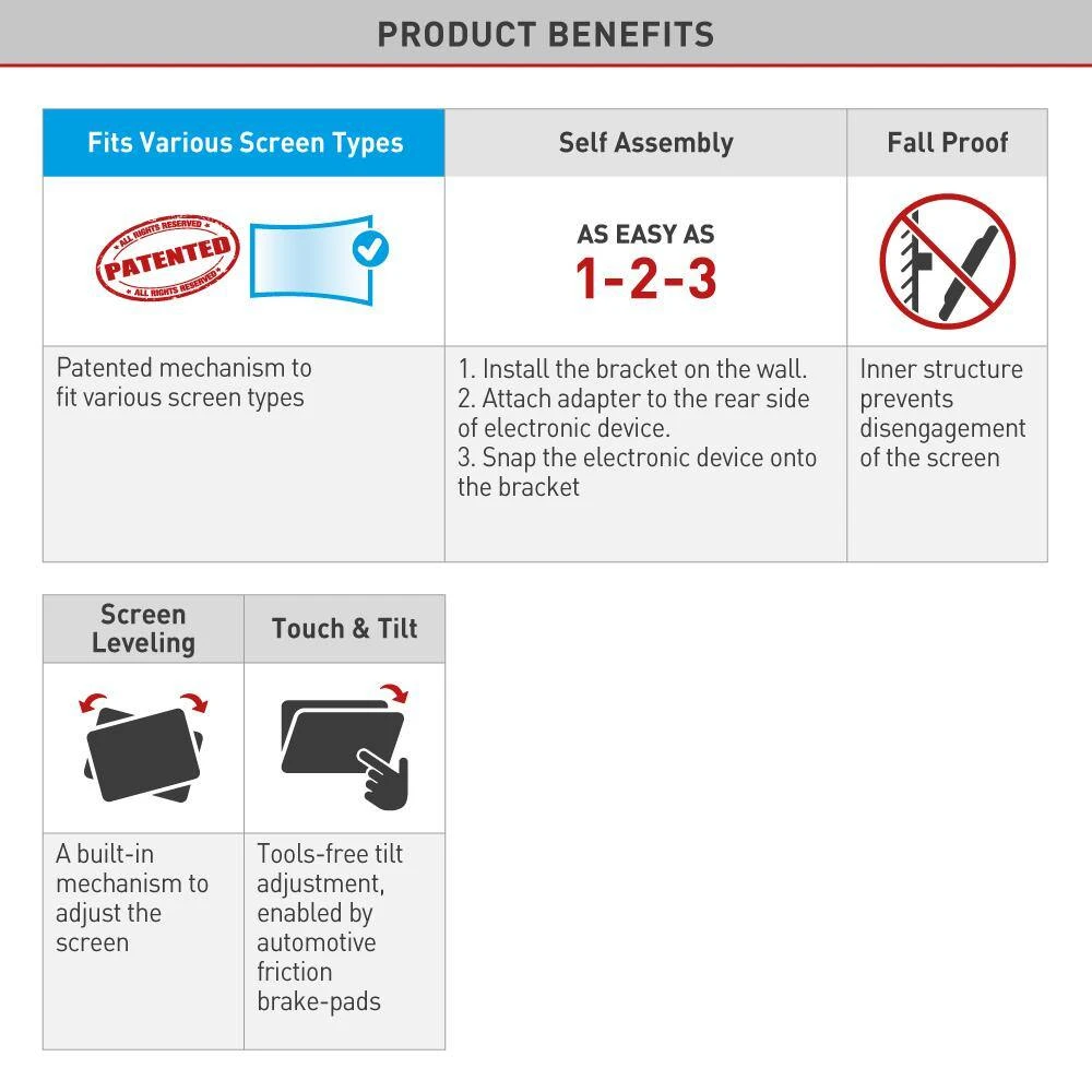- Self assembly – 1 attach adapter to the rear side of electronic device, 2 install the bracket on the wall, 3 snap the electronic device onto the bracket