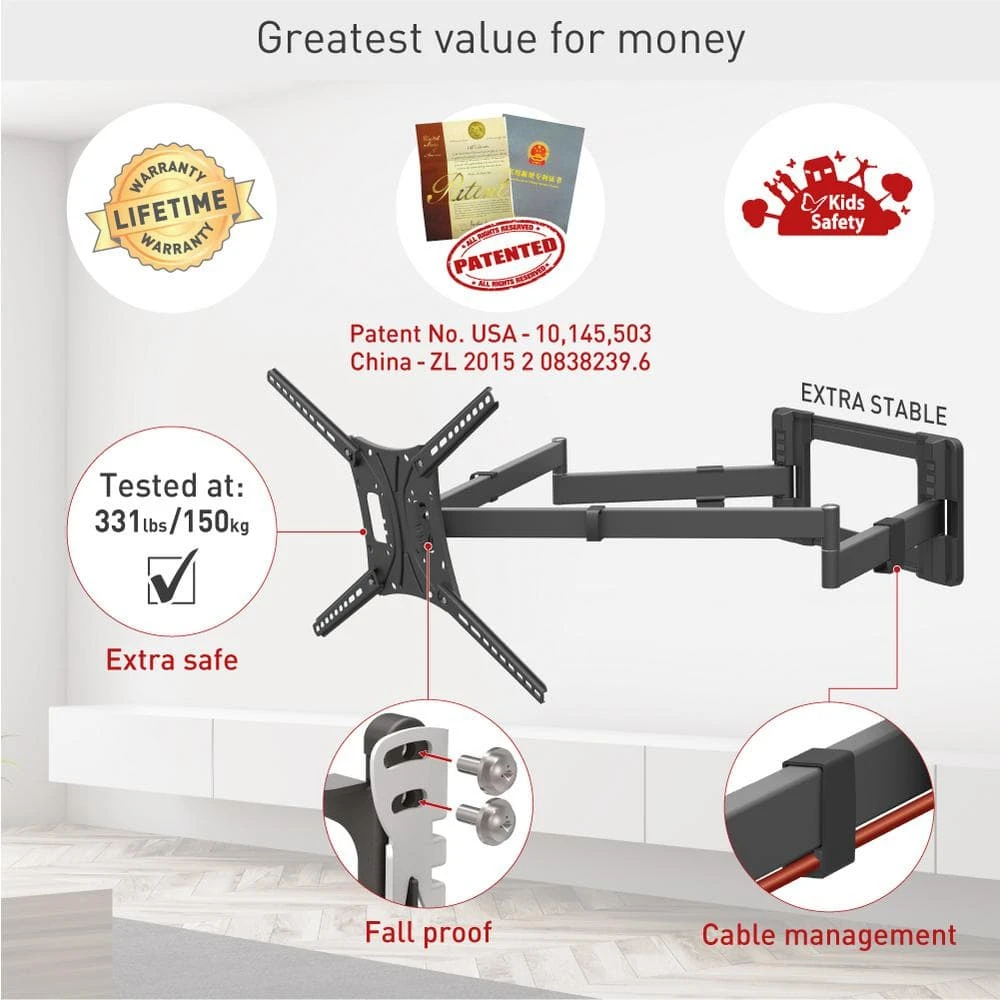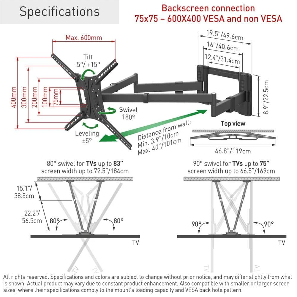 The Barkan full motion, 4 – movement TV mount with rotate, fold, swivel and tilt options fits flat/curved screens sizes 13 in. to 80 in. and weight up to 110 lbs. The mount is extremely long and stable with 2 strong arms. The minimum distance between the mount and the wall is 4 in. and the maximum distance is 39.9 in. which allows 90° swivel for TVs up to 75 in. It fits TVs with VESA standard (Bracket Mounting Holes Patterns) 75×75, 100×100, 200×100, 200×200, 300×300, 300×400, 400×200, 400×300, 400×400, 600×400 mm and non VESA up to 600 mm x 400 mm. In order to offer a better point of view, the mount has 3 pivots: near the wall 180°, foldable 360°, swivel near the screen connection plate 120° and also tool free tilt from -5 till 15°. The mount has a lifetime warranty and its color is black. Please check the list of included screen-connection screws in the assembly instructions. If your screen requires different screen-connection screws, please purchase them in your local hardware store or consult us. If you are satisfied with the product, please leave a review. If you are not satisfied please contact us and we will solve the problem for you.