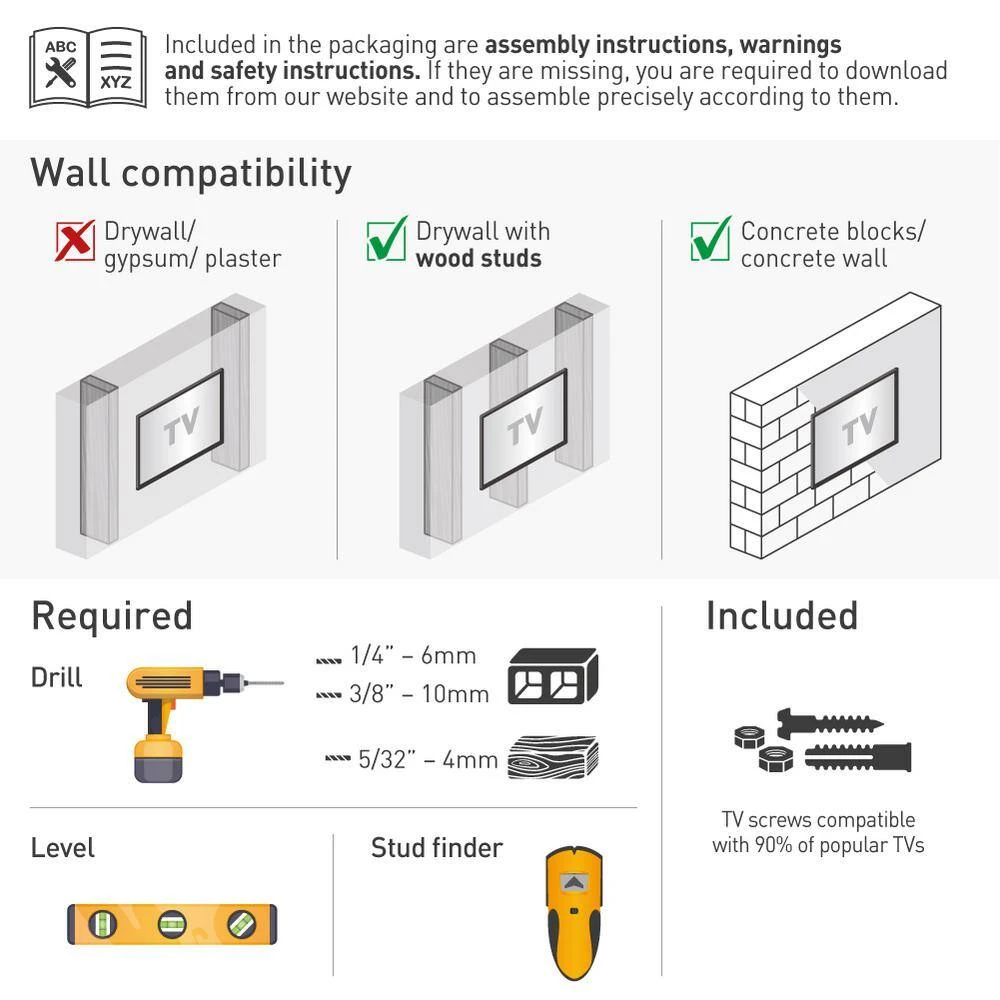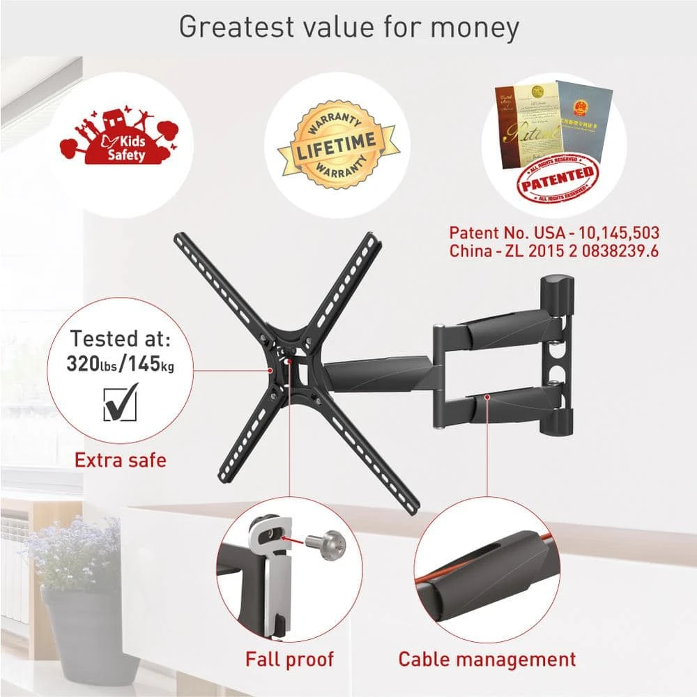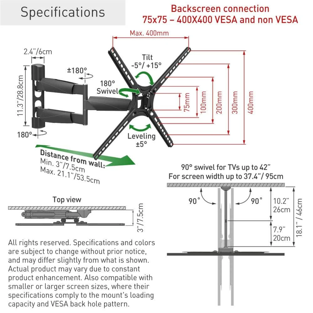 The Barkan full motion, four – movement TV mount with rotate, fold, swivel and tilt options fits flat / curved screens sizes 13 – 65 in. and weight up to 80 lbs. The minimum distance between the mount and the wall is only 2.9 in. and the maximum distance is 21 in. It is extremely extendable in open position therefore allows viewing from a variety of places and locating the screen around the corner of a wall. Fits TVs with VESA standard (Bracket Mounting Holes Patterns) 75×75, 100×100, 100×200, 200×100, 200×200, 300×300, 200×400, 300×400, 400×300, 400×400 mm and non VESA up to 400×400 mm. In order to offer a better point of view, the mount has three pivots: near the wall 180°, fold 360°, swivel near the screen connection plate 180° and also tool free tilt from -5 till 15°. The mount has a lifetime warranty and its color is black. Please check the list of included screen-connection screws in the assembly instructions. If your screen requires different screen-connection screws, please purchase them in your local hardware store or consult us at sales.usaatbarkanmounts.com. If you are satisfied with the product, please leave a review. If you are not satisfied please contact us at https://www.barkanmounts.com/support and we will solve the problem for you.