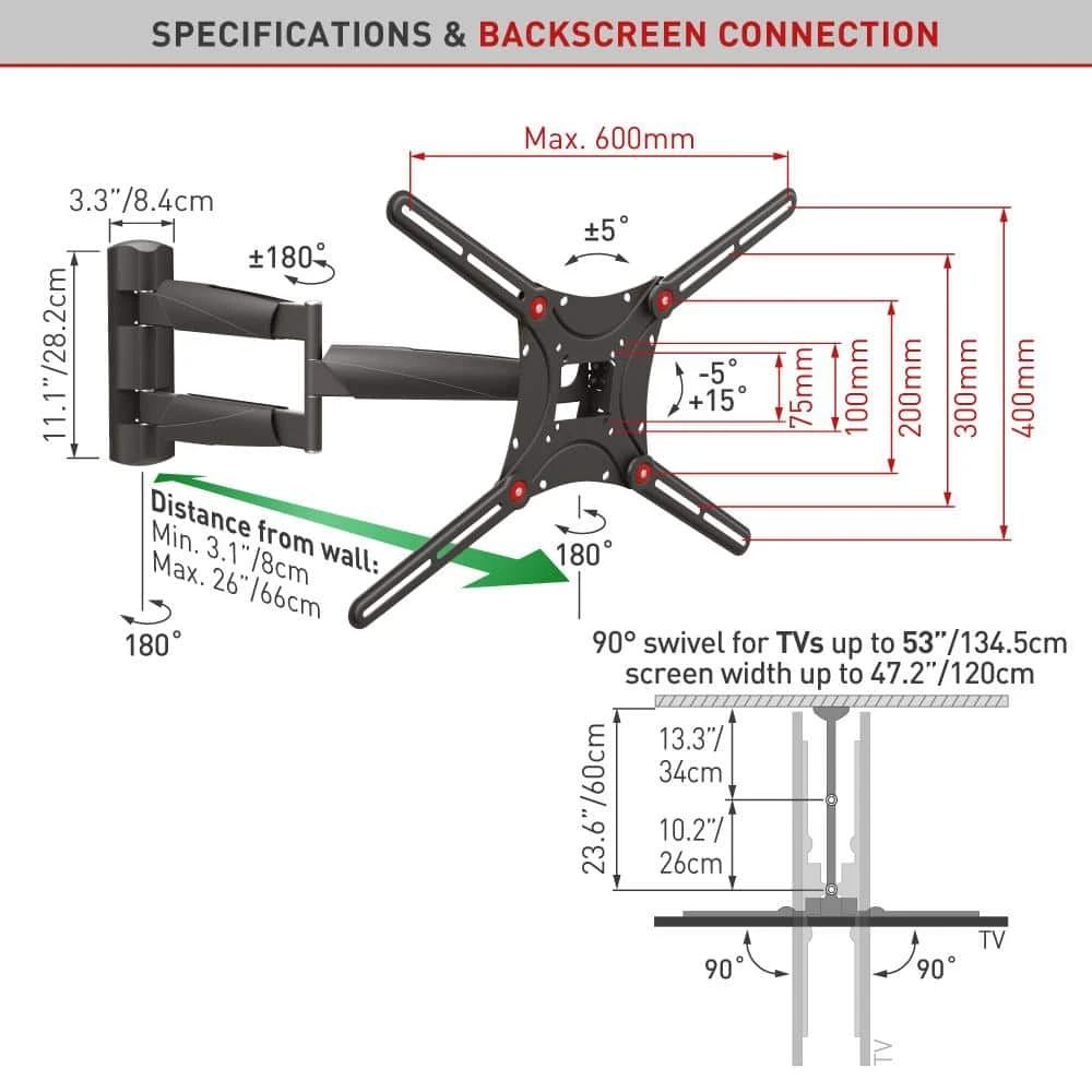 The Barkan full motion, 4 movement TV mount with rotate, fold, swivel and tilt options fits flat/curved screens sizes 13 in. – 75 in. and weight up to 95 lbs. The minimum distance between the mount and the wall is only 3 in. and the maximum distance is 26.1 in. which allows 90° swivel for screens up to 52 in. (width up to 47.2 in.) It is extremely extendable in open position therefore allows viewing from a variety of places and locating the screen around the corner of a wall. In closed position provides low profile mounting. It fits TVs with VESA standard (Bracket Mounting Holes Patterns) 75 mm x 75 mm, 100 mm x 100 mm, 100 mm x 200 mm, 200 mm x 100 mm, 200 mm x 200 mm, 200 mm x 300 mm, 300 mm x 300 mm, 300 mm x 400 mm, 400 mm x 200 mm, 400 mm x 300 mm, 400 mm x 400 mm, 400 mm x 600 mm, 600 mm x 300 mm, 600 mm x 400 mm and non VESA up to 600 mm x 400 mm. In order to offer a better point of view, the mount has 3 pivots: near the wall 180°, foldable 360°, swivel near the screen connection plate 180° and also tool free tilt from minus 5° till 15°. The mount has a lifetime warranty and its color is black. Please check the list of included screen-connection screws in the assembly instructions. If your screen requires different screen-connection screws, please purchase them in your local hardware store or consult us. If you are satisfied with the product, please leave a review. If you are not satisfied please contact us and we will solve the problem for you.