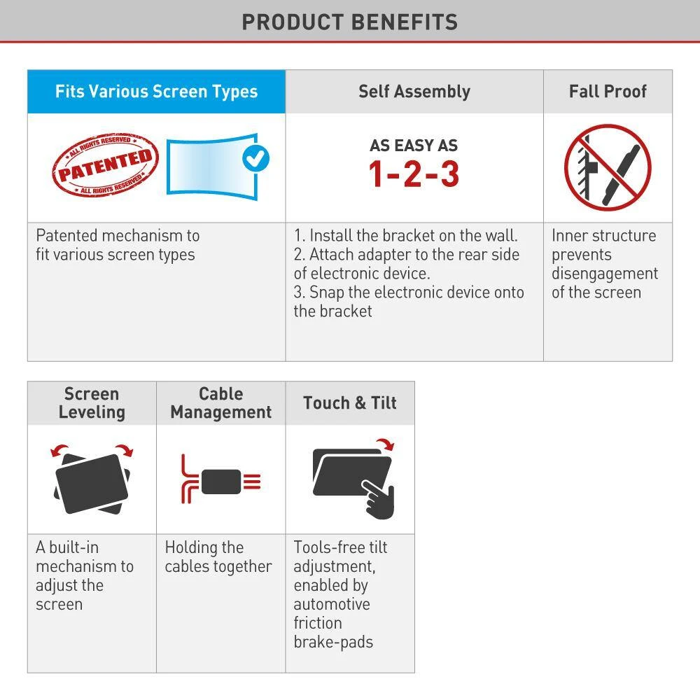 - Patented mechanism to fit various screen types