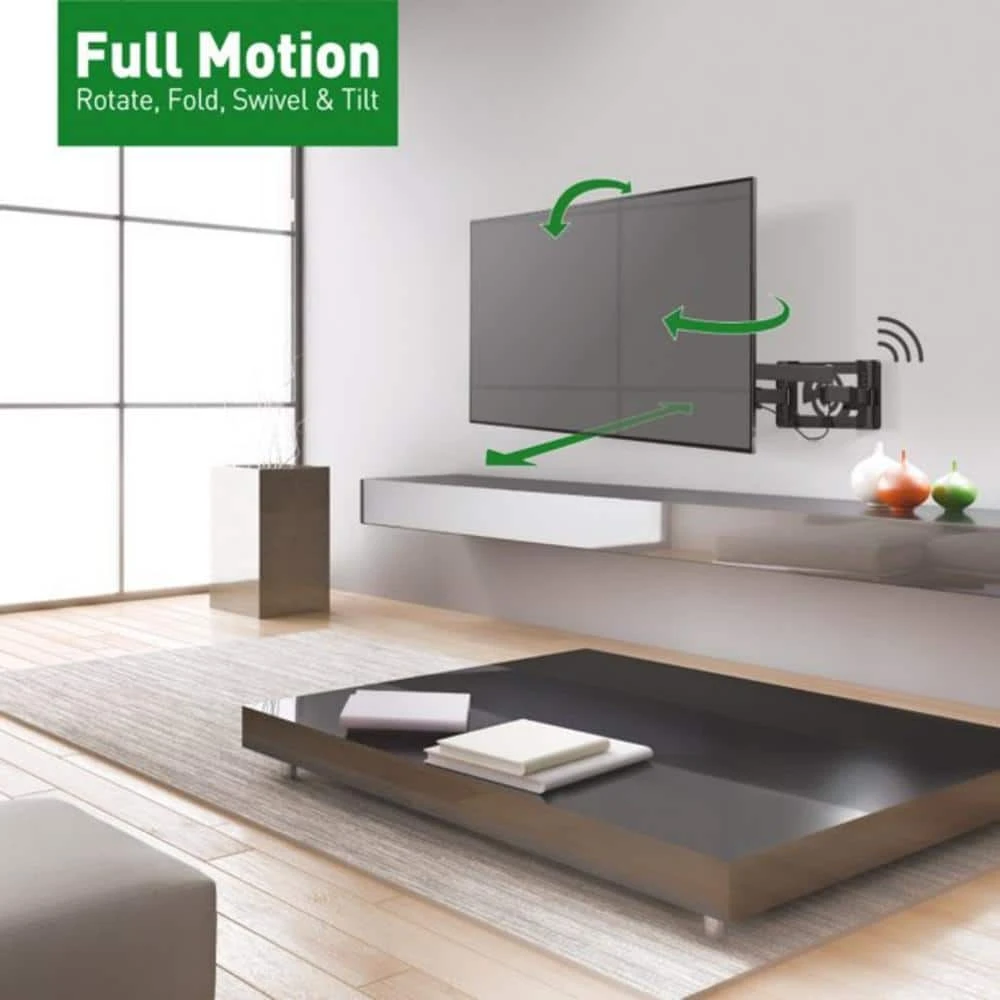 The Barkan full motion, 4 – movement TV mount with integrated HDTV indoor antenna fits flat/curved screens sizes 13 in. – 90 in. and weight up to 132 lbs. The large mass of metal in the mount creates a better reception for the HDTV antenna. The mount is extremely long and stable with two strong arms. The minimum distance between the mount and the wall is only 3.6 in. therefore allows low profile mounting. The maximum distance is 27.6 in. which allows a 60° swivel for TVs up to 65 in. and 90° swivel for TVs up to 43 in./109cm (width up to 39 in./99cm). It fits TVs with VESA standard (Bracket Mounting Holes Patterns) 75×75, 100×100, 100×200, 200×100, 200×200, 300×300, 300×400, 400×200, 400×300, 400×400, 600×400 mm and non VESA up to 600×400 mm. In order to offer a better point of view, the mount has 3 pivots: near the wall 180°, fold 360°, swivel near the screen connection plate 180° and a tool free tilt from -5° till 15°. The built-in coaxial cable connects to a Smart TV or a decoder. The mount has a lifetime warranty, the integrated antenna has 2-year warranty and its color is black. Please check the list of included screen-connection screws in the assembly instructions.