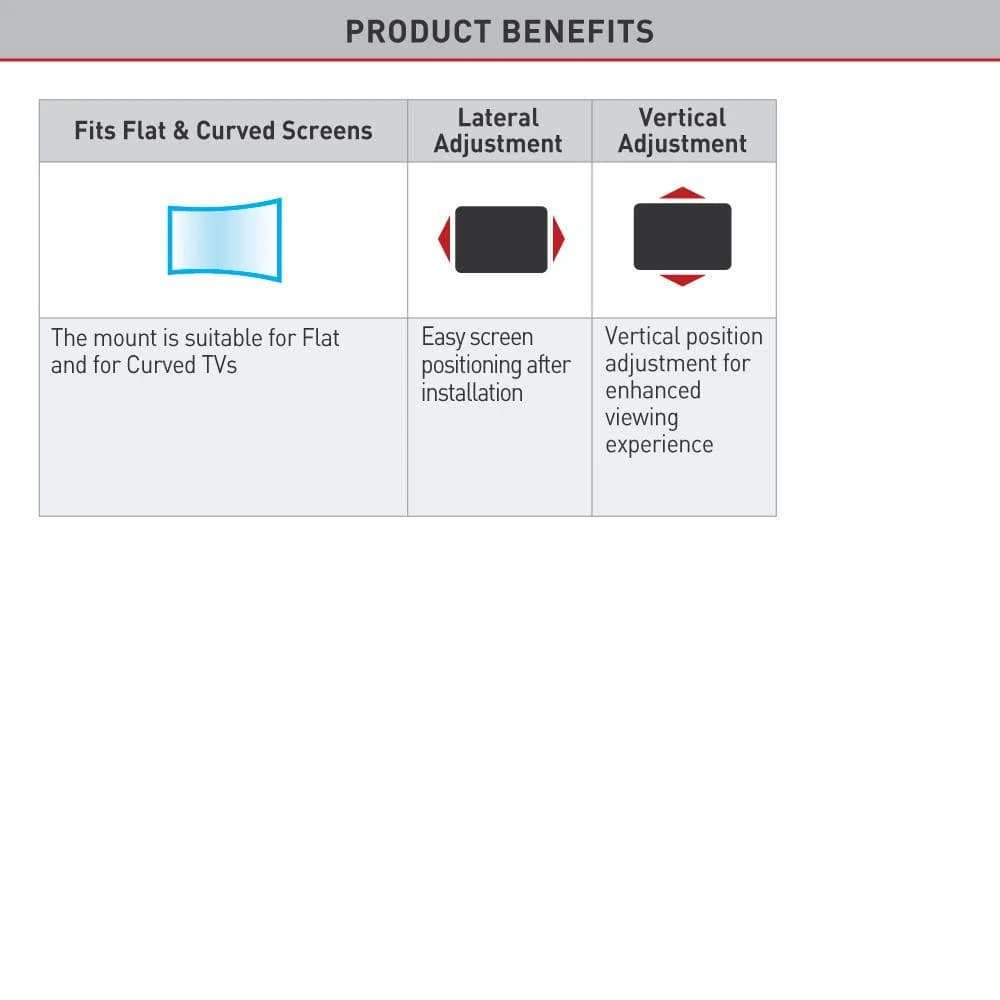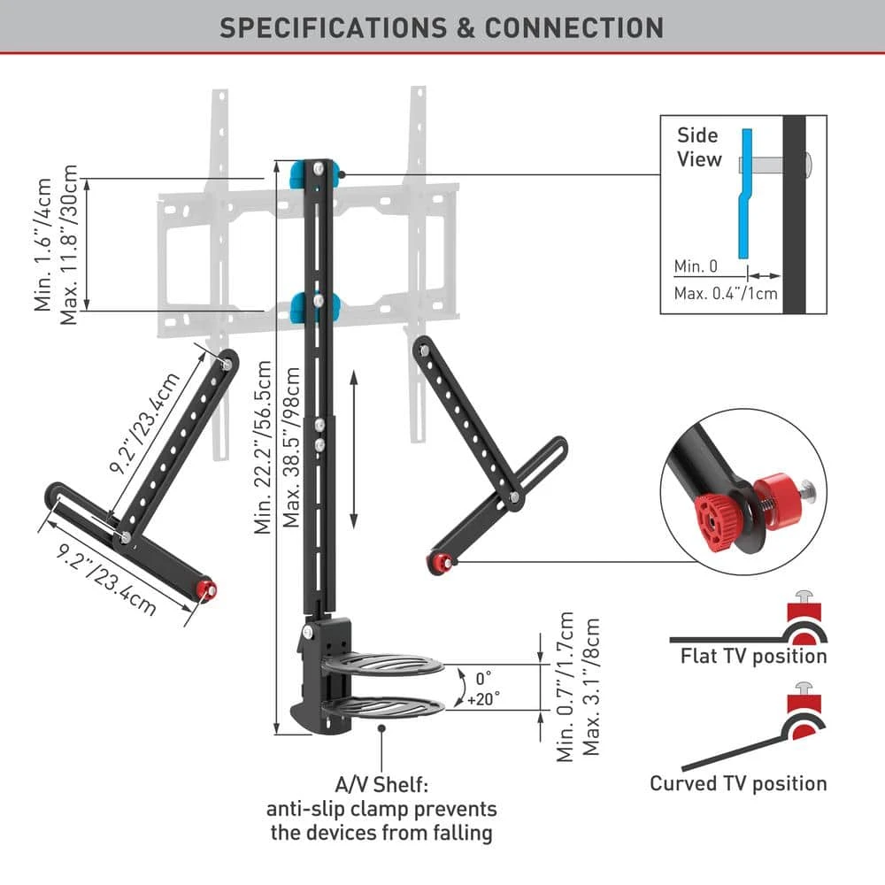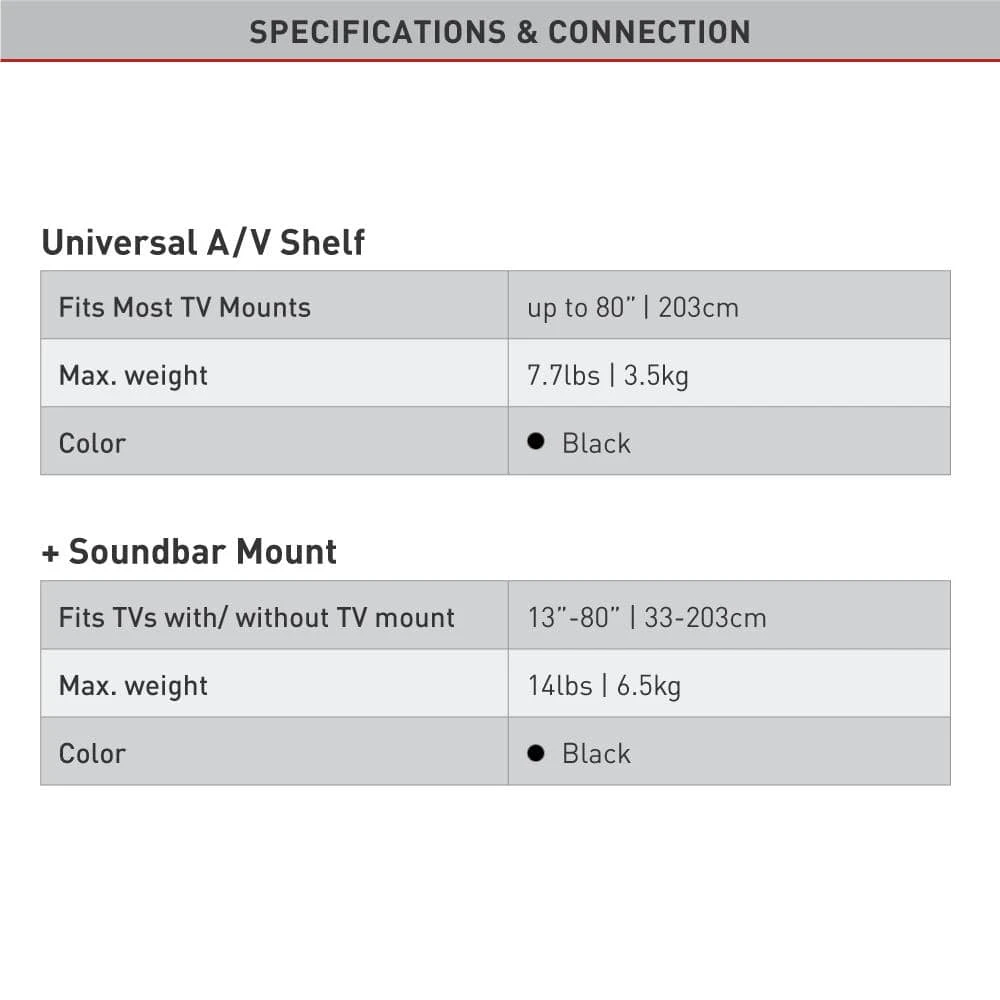 The Barkan soundbar mount + universal AV shelf has a conjunctive structure to allow ultimate compatibility to a wide range of TV and Soundbar sizes. The AV shelf holds up to 7.71 lbs and supports components 0.78 to 3.1 inch high. The Soundbar mount holds up to 14.3 lbs Both are suitable for flat and curved TVs and can be installed above or below the screen. It is installed by connecting the steel arms to the TV mount therefore spares the need for drilling holes. It’s suitable for all Barkan mounts (excluding EA02) and most TV mounts brands in the market. The mounts have a 5 year warranty and their color is black. **If you are satisfied with the product, please leave a review. If you are not satisfied please contact us at https://www.barkanmounts.com/support and we will solve the problem for you**