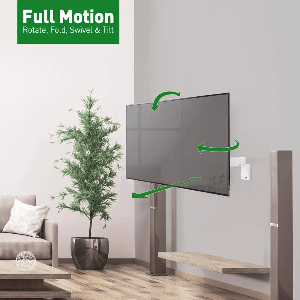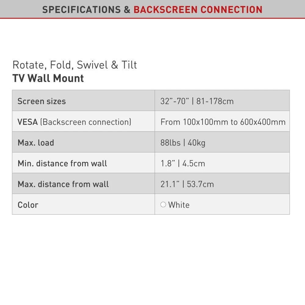 The Barkan full motion, 4 – movement TV mount with rotate, fold, swivel and tilt options fits flat / curved screens sizes 32 in. – 70 in. and weight up to 88 lbs. The minimum distance between the mount and the wall is only 1.77 in. therefore providing low profile mounting. The maximum distance is 21.1 in. It fits TVs with VESA standard (Bracket Mounting Holes Patterns) 100×100, 100×200, 200×100, 200×200, 300×300, 300×400, 400×200, 400×300, 400×400, 600×400 mm and non VESA up to 600×400 mm. In order to offer a better point of view, the mount has 3 pivots: near the wall 180°, foldable 360 degrees, swivel near the screen connection plate 180 degrees and also tool free tilt from 0 till 10°. The mount has a lifetime warranty and its color is white. Please check the list of included screen-connection screws in the assembly instructions. If your screen requires different screen-connection screws, please purchase them in your local hardware store or consult us at [email protected]. If you are satisfied with the product, please leave a review. If you are not satisfied please contact us at https://www.barkanmounts.com/support and we will solve the problem for you.