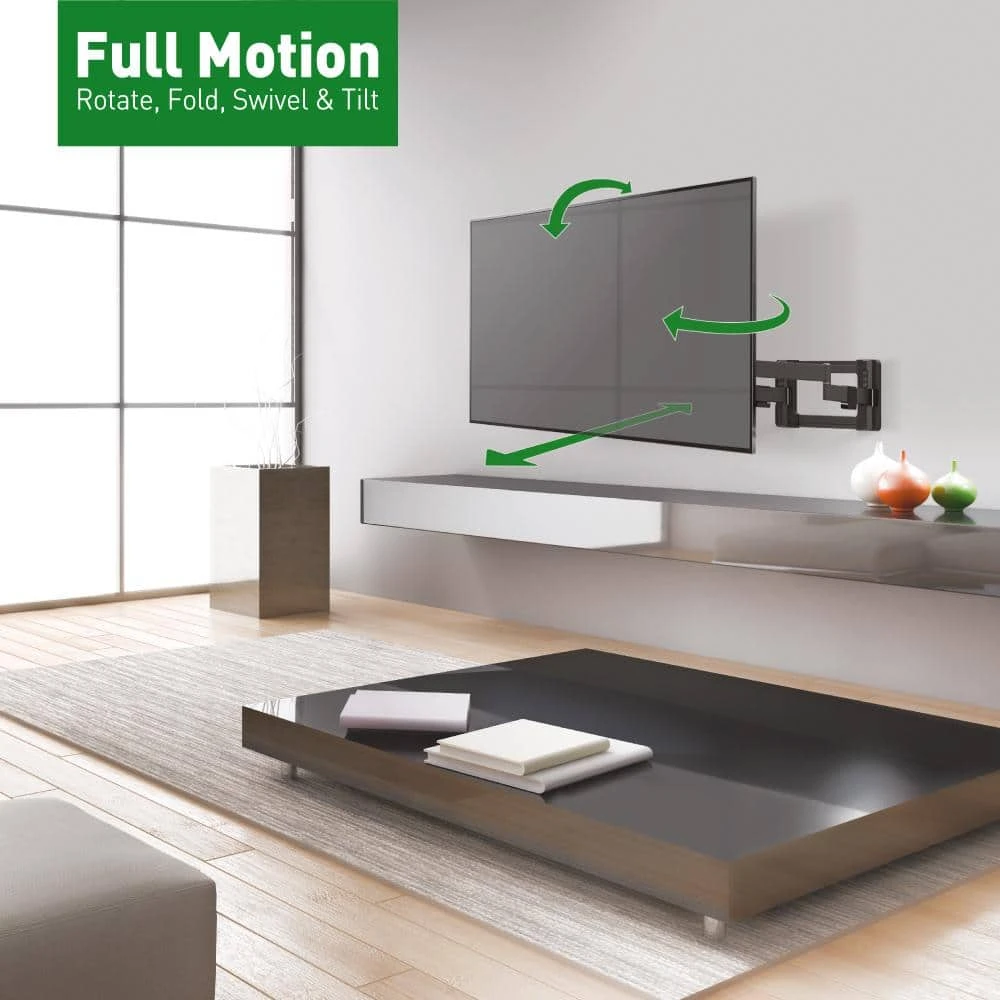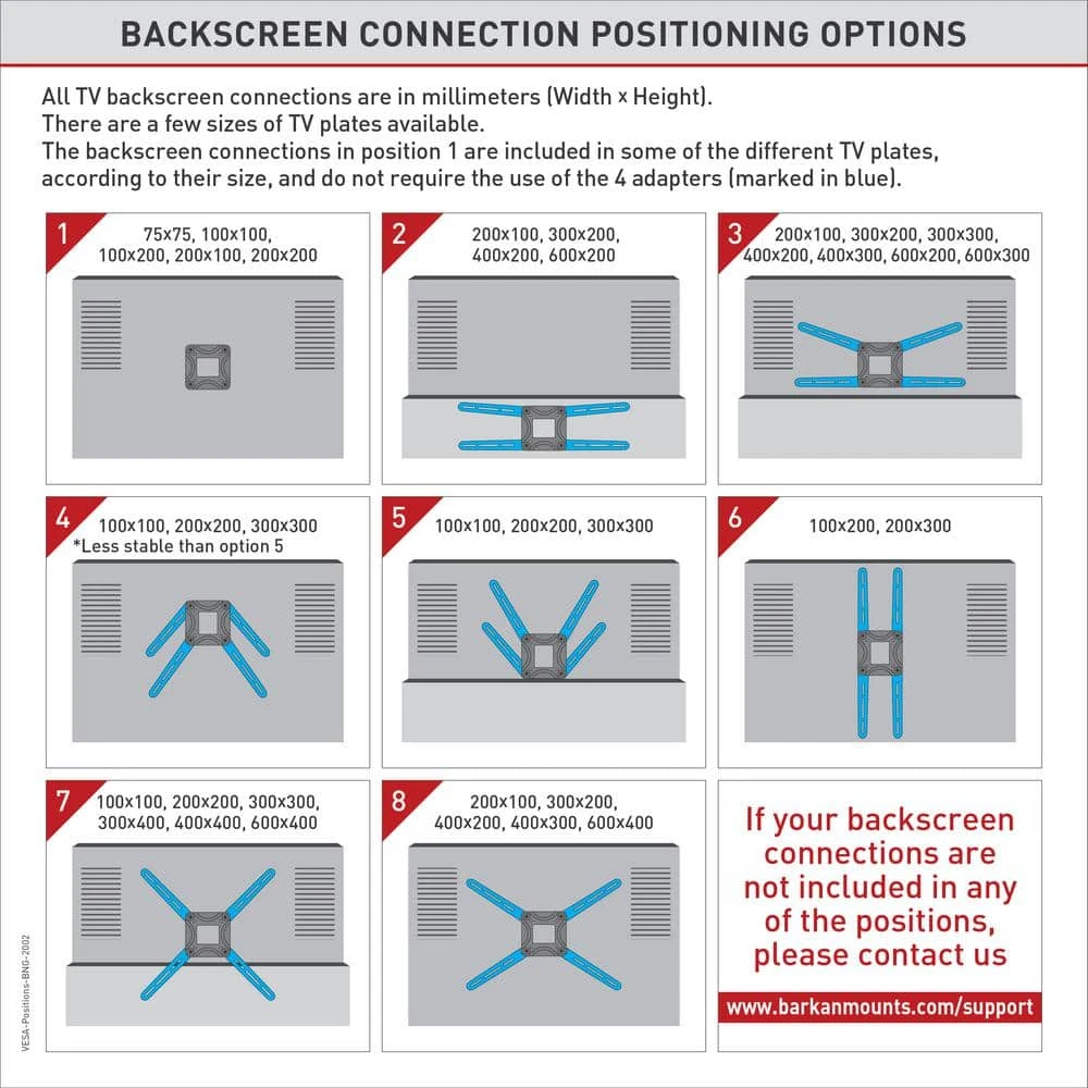 The Barkan full motion, four – movement TV mount with rotate, fold, swivel and tilt options fits flat / curved screens sizes 40 to 90 in. and weight up to 132 lbs. The mount is extremely long and and stable with two strong arms. The minimum distance between the mount and the wall is only 3 in. therefore allows low profile mounting. The maximum distance is 27.5 in. which allows a 65 in. TV to rotate up to 60°. It fits TVs with VESA standard (Bracket Mounting Holes Patterns) 200×100, 200×200, 300×300, 200×400, 300×400, 400×300, 400×400, 600×400 mm and non VESA up to 600×400 mm. In order to offer a better point of view, the mount has three pivots: near the wall 180°, foldable 360°, swivel near the screen connection plate 180° and also tool free tilt from 0 till 10°. The mount has a lifetime warranty and its color is black. Please check the list of included screen-connection screws in the assembly instructions. If your screen requires different screen-connection screws, please purchase them in your local hardware store or consult us at [email protected]. If you are satisfied with the product, please leave a review. If you are not satisfied please contact us at https://www.barkanmounts.com/support and we will solve the problem for you.
