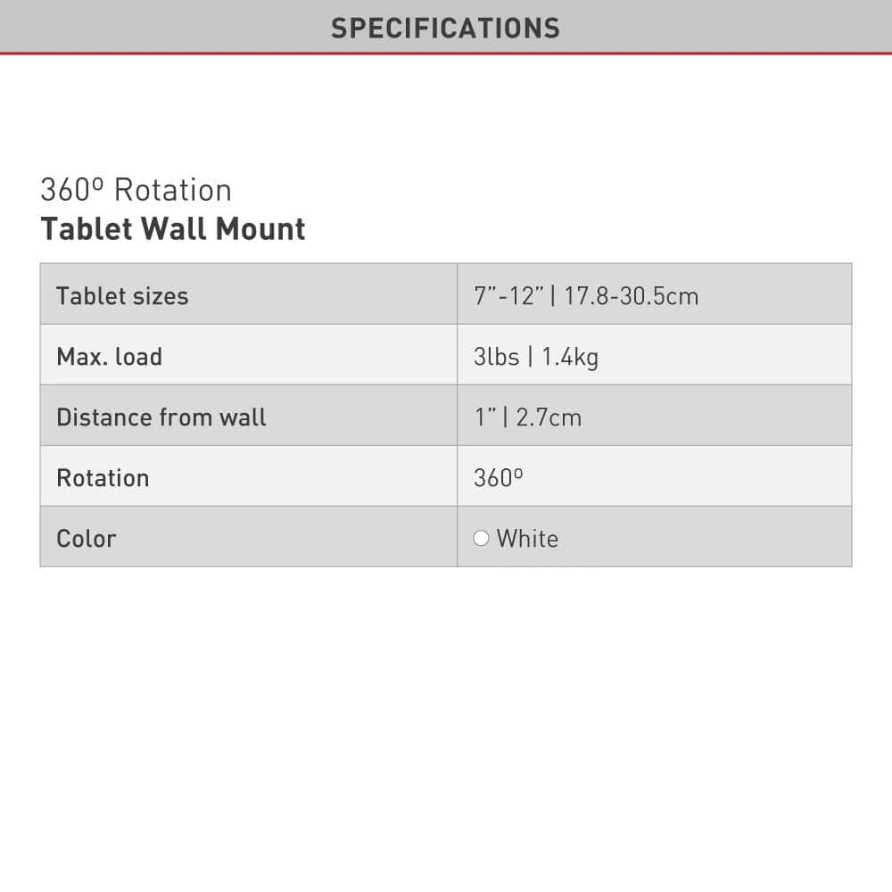 The Barkan fixed tablet wall mount fits tablets sizes 7 – 12 inches and weight up to 2.2 lbs. The distance from the wall is only 1 in. The mount has a 5 year warranty and its color is white. **If you are satisfied with the product, please leave a review. If you are not satisfied please contact us at https://www.barkanmounts.com/support and we will solve the problem for you**