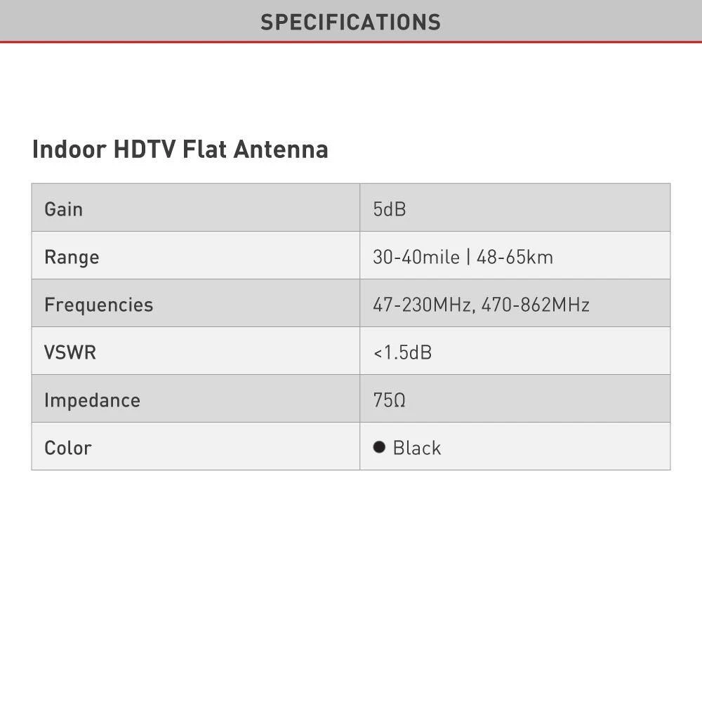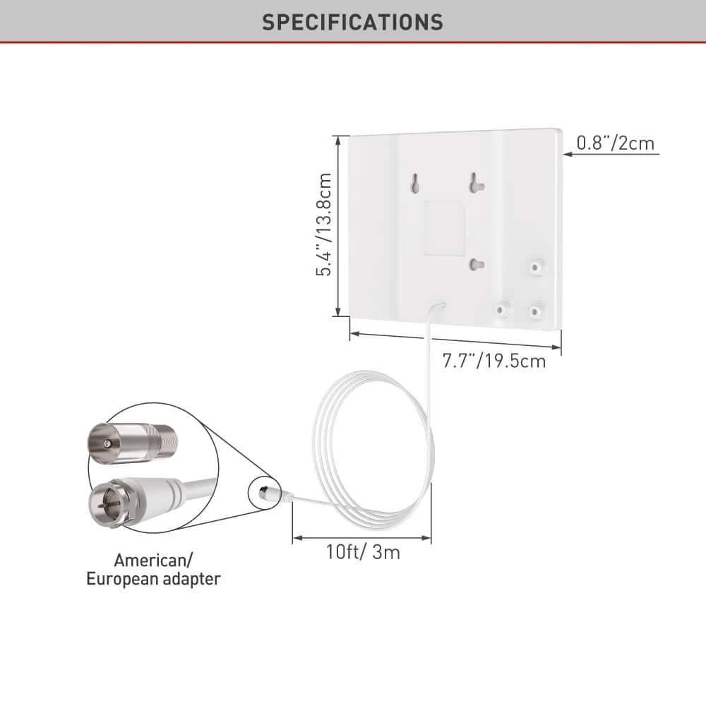 The Barkan indoor flat HDTV antenna allows watching free HD channels such as ABC, CBS, NBC, PBC, Fox and many more. The antenna’s range is 30 – 40 miles and works in frequencies 47 – 230 MHz, 470 – 862 MHz. A 10 ft coaxial cable is included. It has a thin design, doesn’t affect the appearance of the room and doesn’t take up place. The antenna can be mounted on a wall or it can stand on a counter. The antenna is white and has a 2 year warranty. **If you are satisfied with the product, please leave a review. If you are not satisfied please contact us at https://www.barkanmounts.com/support and we will solve the problem for you**