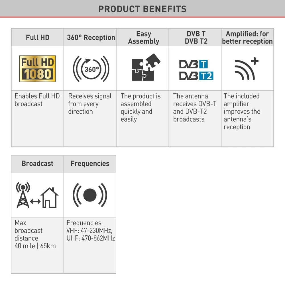 - The antenna receives DVB-T and DVB-T2 broadcasts