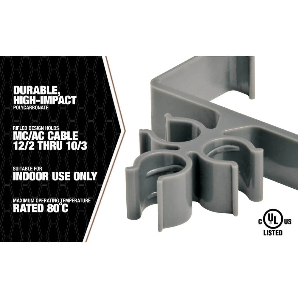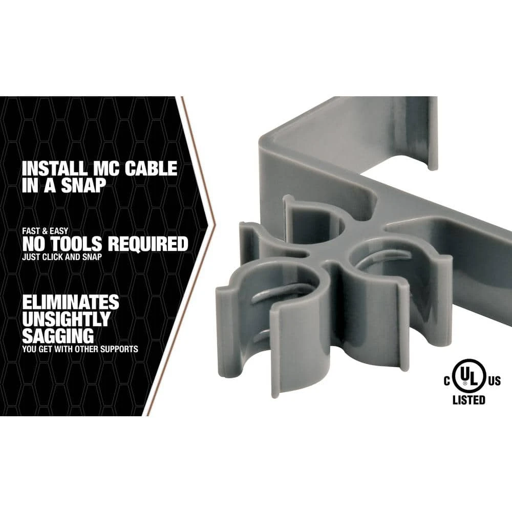 Keep those pliers in your pocket. Clip-it makes installing MC Cable a snap. No more reaching for tools to secure your cable. Madison Electric Products makes it fast and easy. Our patented ri?ed polycarbonate design will hold MC or armored cable 12/2 through 10/3, eliminating the unsightly sagging you get with other supports. The Clip-it MC products are made from durable hi-impact polycarbonate, and can be used universally. Clip-it meets NEC 2008 code for plenum ratings, and tested tough enough to be used in environments -30 degrees F thru 250 degrees F.
