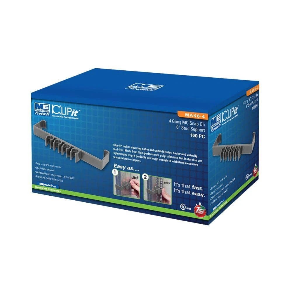 Keep those pliers in your pocket. Clip-it makes installing MC Cable a snap. No more reaching for tools to secure your cable. Madison Electric Products makes it fast and easy. Our patented rifled polycarbonate design will hold MC or armored cable 12/2 through 10/3, eliminating the unsightly sagging you get with other supports. The Clip-it MC products are made from durable hi-impact polycarbonate, and can be used universally. Clip-it meets NEC 2008 code for plenum ratings, and tested tough enough to be used in environments -30ËšF thru 250ËšF.