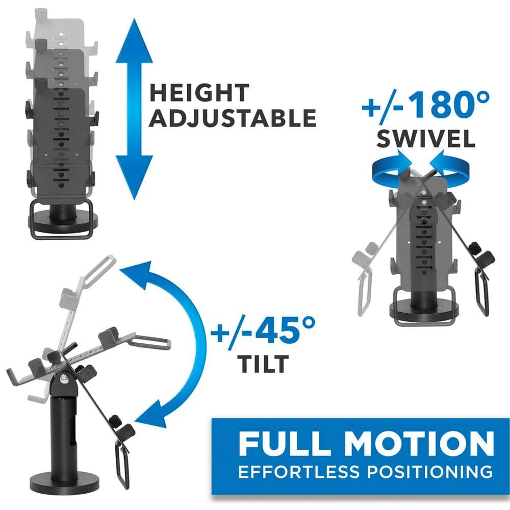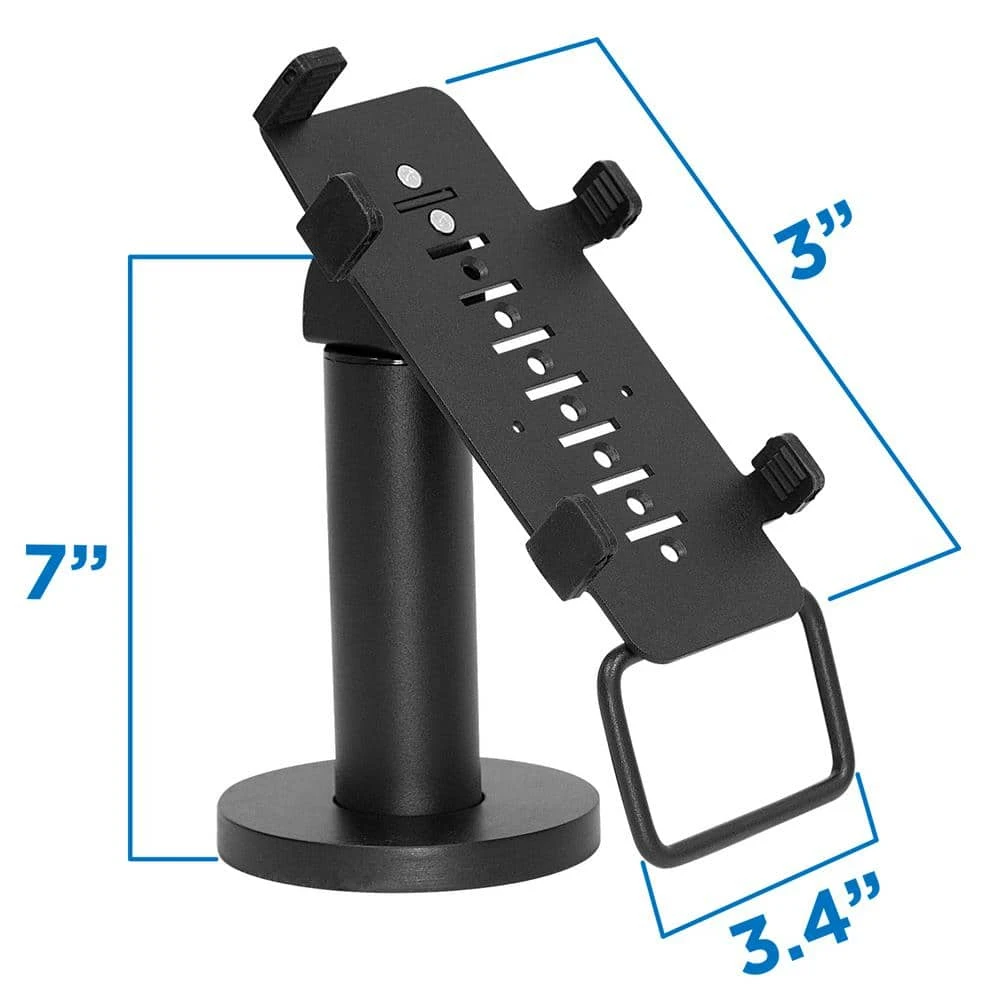 MI-3792 is the perfect stand to securely mount a VeriFone VX820 credit card machine to the store counter. Designed with a 7 inch tall pole, this stand swivels +/- 180 degrees and tilts +/- 45 degrees for a more seamless customer-merchant interaction. Made of heavy duty steel to withstand heavy use for a long amount of time. Bolts securely to the counter to deter theft. Conceal cables through the pole for an organized look. Terminal not included.