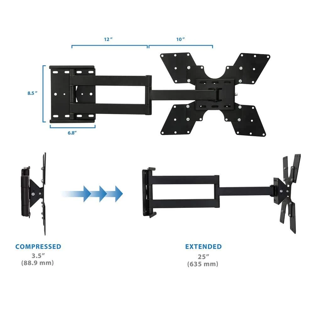 The MI-411L dual-bar articulating TV wall mount is perfect for installations in corners or above fireplaces. This anti-sway mount features dual-bar construction, which will keep your display from sagging, swaying or leaning. Create an ergonomic viewing experience by tilting or swiveling the mount in whatever position you need. Long extension range of up to 25 in. so you can adjust your TV to suit your layout. Large holding capacity of 100 lbs. and easy install with single stud mounting. All necessary hardware and instructions are included.