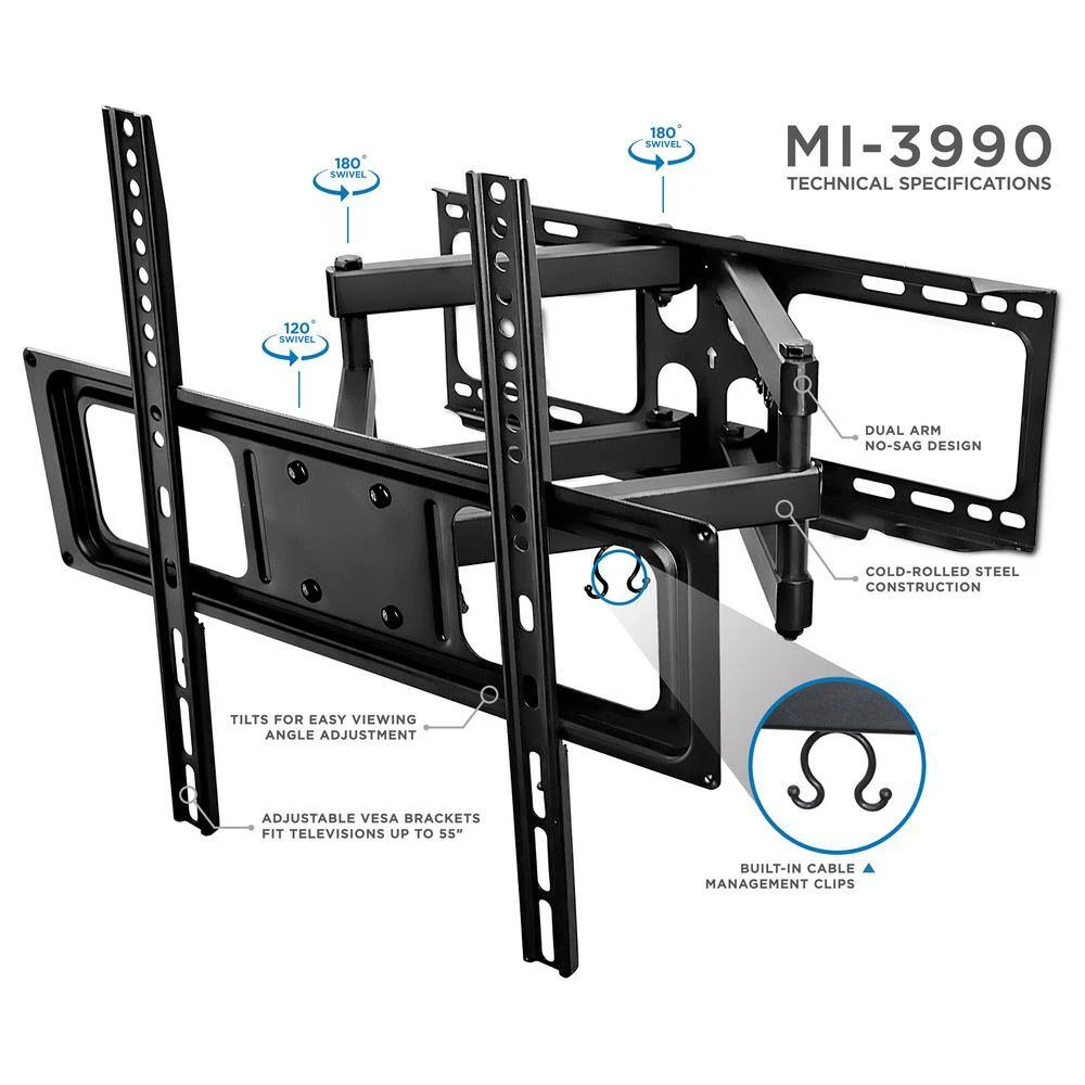 The MI-3990 dual arm wall mount-it! can extends out 18.3 in. from the wall to suit any seating arrangement. Further customize your viewing experience by tilting and swiveling to get a perfect position. Adjusting the angle is quick and easy. The dual swivel arms increase the sturdiness of the design and the heavy-duty construction can support up to 88 lbs., so you can rest assured that your screen will be safe and sound once it’s installed. Cable management clips keep cables from your DVD player, cable box or streaming device to the TV organized.