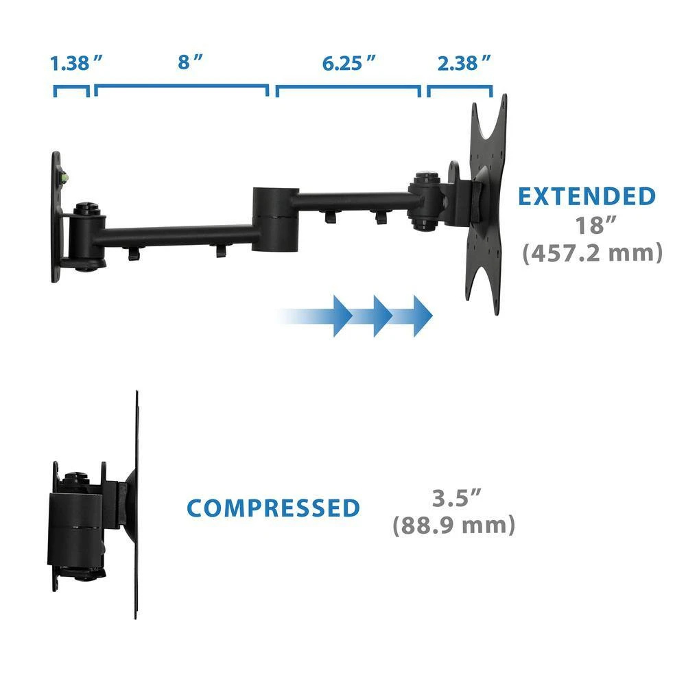 Enjoy up to 18 in. of arm extension with MI-4151. Rotate 360° as well as swivel and tilt to position your TV for ideal viewing. The removable VESA plate simplifies installation, simply secure the mount arm on the wall, attach the VESA plate on the back of the TV and slide in the VESA plate to the mount arm. The load bearing portions of the mount are constructed from high grade steel providing a sturdy and reliable mount and separate cover-pieces for the wall plate and pivot joints providing a clean finished look. The-package includes the mount, manual, and all necessary installation hardware.