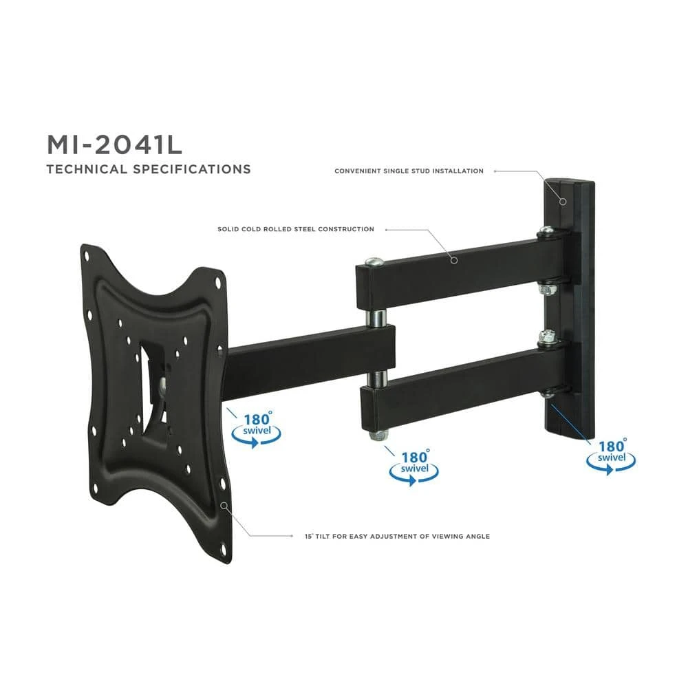 MI-2041L is a versatile wall mount designed for both TVs and computer monitors. Its full motion capabilities allow you to place your TV in the perfect position for a better view from anywhere in the room. It can extend and retract, making it useful in a variety of different spaces. Its wall plate allows you to mount to a single stud, making it a quicker and easier installation experience.