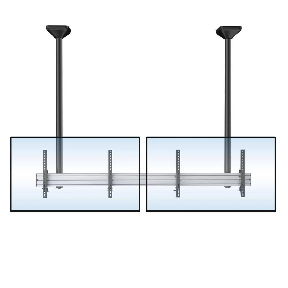 The MI-512 dual TV ceiling mount is the perfect option for mounting 2 flat screens in hotels, bars, restaurants and other public places. This heavy-duty ceiling mount has a unique ceiling bracket design featuring U-shaped tracks that allow the mount to supports up to 110 lbs. per screen, while the VESA brackets can accommodate VESA mounting patterns up to 600 mm x 400 mm (max) for compatibility with 45 in. to most 55 in. flat panel televisions. Necessary hardware is included.