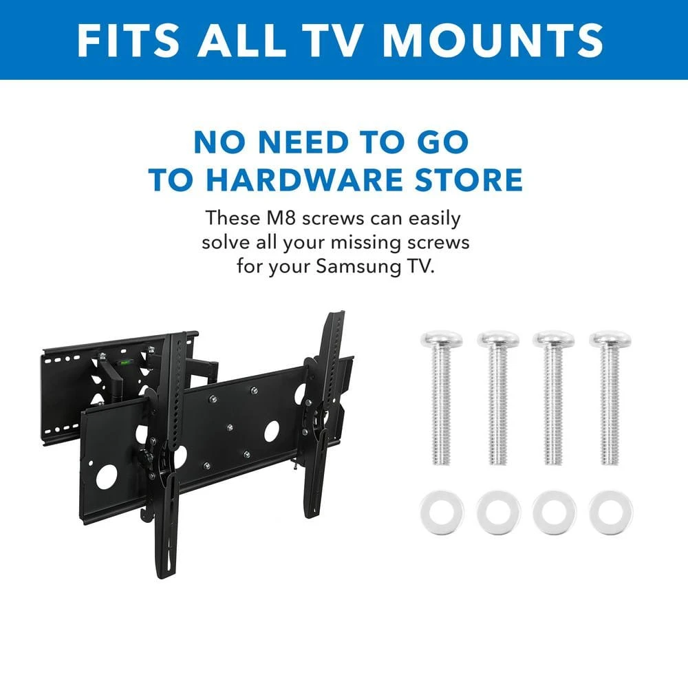Not every TV wall mount comes with the M8 bolts Samsung TVs require. The MI-M8KIT saves you from a trip to the hardware store to mount your Samsung TV. Extra-Long M8x45 mm TV Mounting Bolts are made from high-strength steel. Install with Phillips head screwdriver. PACKAGE INCLUDES: 4-pieces of M8 x 45 mm, Pitch 1.25 mm Stainless Solid Steel Screws, Washers.